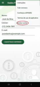 Obs.: Se sua versão instalada for inferior à 1.7.1, você precisará atualizar seu aplicativo na loja de aplicativos. Alternativamente, para remover apenas os seus dados armazenados, e não sua conta, envie um email (o mesmo do cadastro no sistema) para gercal@epamig.site solicitando