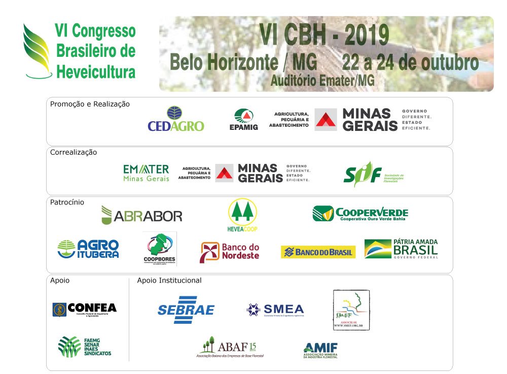 A Empresa de Pesquisa Agropecuária de Minas Gerais (EPAMIG) e o Centro de Desenvolvimento do Agronegócio (Cedagro) vão promover entre os dias 22 a 24 de outubro o 6º Congresso Brasileiro de Heveicultura (CBH). O evento vai ocorrer na sede da Emater-MG, em Belo Horizonte. As inscrições são feitas no site do CBH.