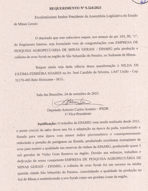 (Belo Horizonte – 3/11/2021) A Empresa de Pesquisa Agropecuária de Minas Gerais (EPAMIG) recebeu votos de congratulações da Assembleia Legislativa de Minas Gerais (ALMG) pela produção e colheita de uvas Syrah no município de São Sebastião do Paraíso (MG). O documento, requerido pelo deputado estadual, Antonio Carlos Arantes, foi elaborado porque a safra de 2021 foi a mais produtiva desde o plantio das videiras, em 2011.