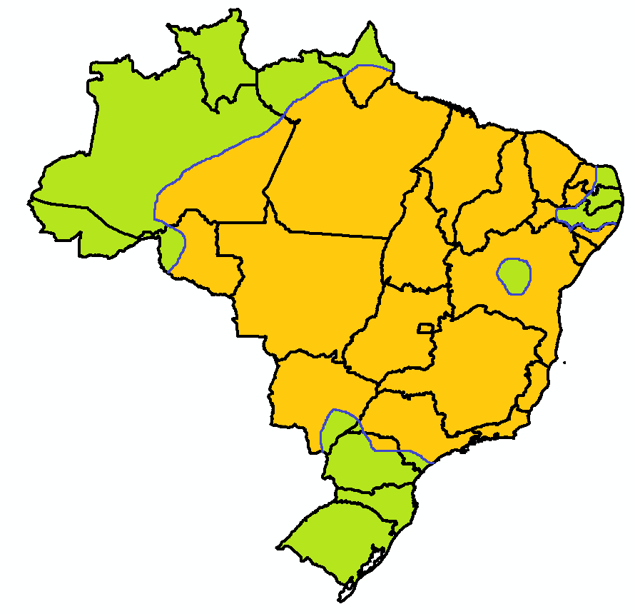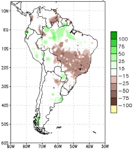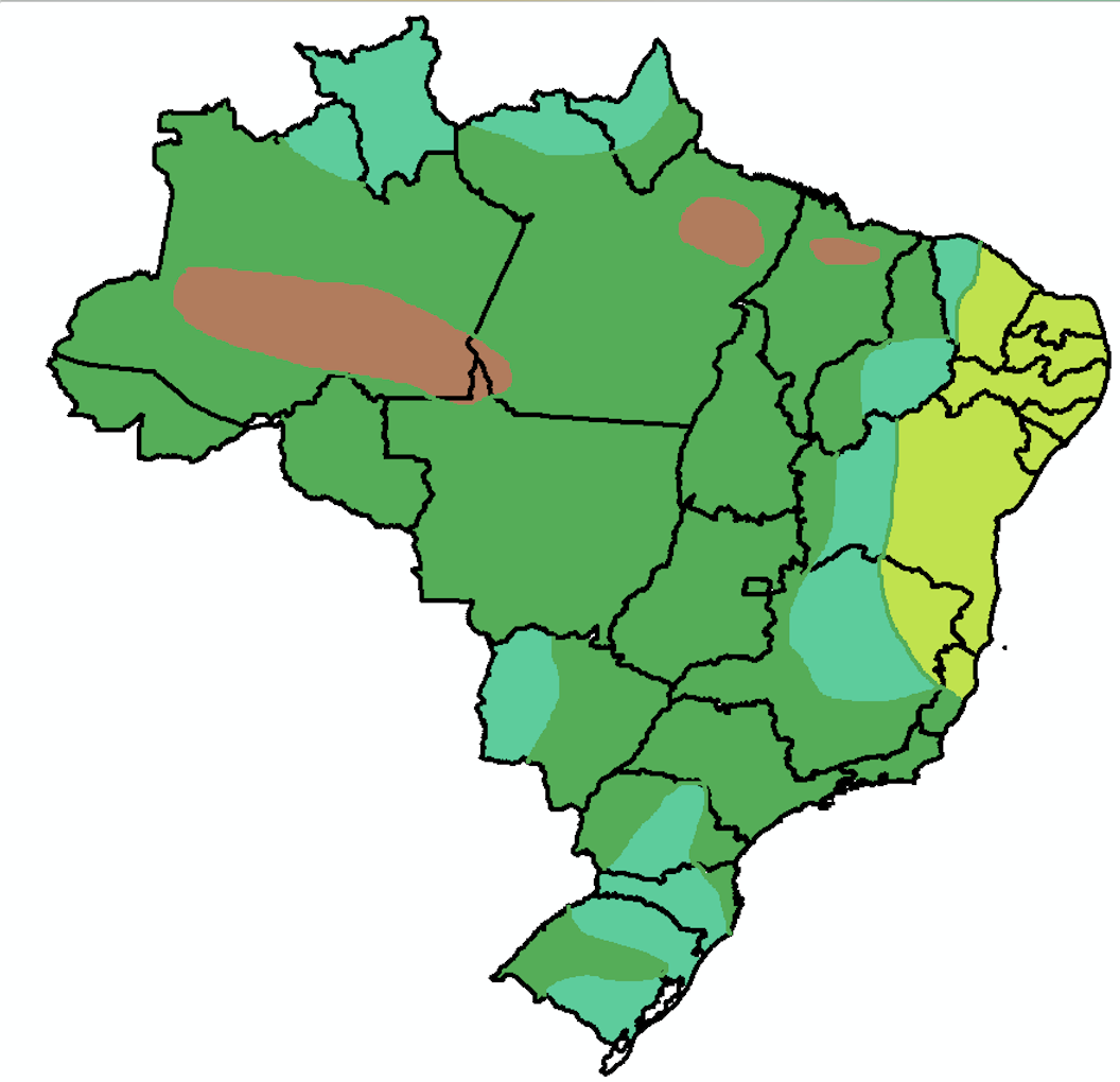 Quando a distribuição das chuvas ocorre dentro da normalidade, no mês de fevereiro, é esperado que chova entre 25 a 100 mm entre na faixa verde claro, que inclui o norte do Espírito Santo, o nordeste de Minas Gerais, o leste da Bahia, Sergipe, Alagoas, Pernambuco, Paraíba, Rio Grande do Norte e o leste do Ceará. Entre 50 a 150 mm, na faixa verde água que vai do norte de Minas Gerais ao oeste da Bahia, sul do Piauí e noroeste do Rio Grande do Norte; bem como o oeste do Mato Grosso do Sul, parte central do Paraná, quase todo o estado de Santa Catarina e as partes norte e sul do Rio Grande do Sul, extremo norte do Amazonas e Pará, Roraima e oeste do Amapá. Na faixa verde escuro estão as demais regiões do Brasil onde a média de chuva fica entre 150 e 300 m, e nas áreas em marrom locais em que a média de chuva no mês costuma ser entre 300 e 500 mm, Amazonas, Pará e Maranhão (Figura 1).