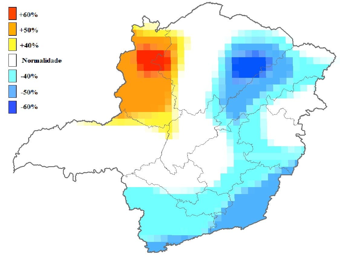 Temperaturas abaixo da média são esperadas na mesorregião Norte e Centro Amazonense, Baixo Amazonas, no Pará, e no Sul de Roraima. Em Minas Gerais, a probabilidade de ocorrência de temperaturas pouco abaixo da média pode ser visualizada na Figura 3. Nas demais regiões brasileiras as temperaturas devem permanecer dentro da média do trimestre, ou seja, dentro da normalidade.