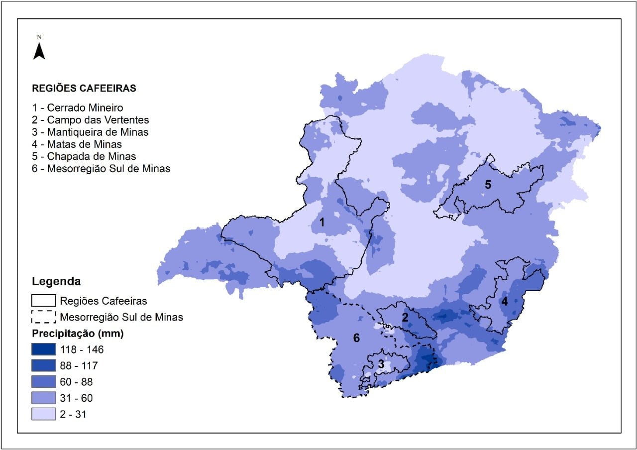 Apesar do menor volume de chuvas no Cerrado Mineiro (Figura 1) pode ser observado, com base na Figura 2, que a maior disponibilidade de água no solo se encontra no Cerrado Mineiro, quando comparado as demais regiões cafeeeiras, bem como no Campo das Vertentes.