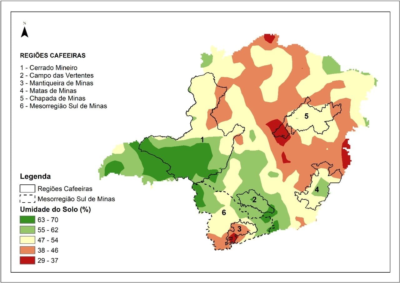 A partir da segunda quinzena de fevereiro foi observada à redução do volume de chuvas em Minas Gerais. No mês de março, a chuva foi mais concentrada no Triângulo e no Sul de Minas, o que contribuiu para a baixa umidade de água no solo em parte de outras regiões cafeeiras do Estado. Em abril, apesar da melhor distribuição das chuvas no Estado, a umidade do solo continuou baixa principalmente em grande parte da região das Matas de Minas, no Sul de Minas e na região da Chapada de Minas. As consequências de tais condições poderão ser reveladas nas próximas semanas, nos lavadores de café, com a maior presença de grãos vazios e malformados.