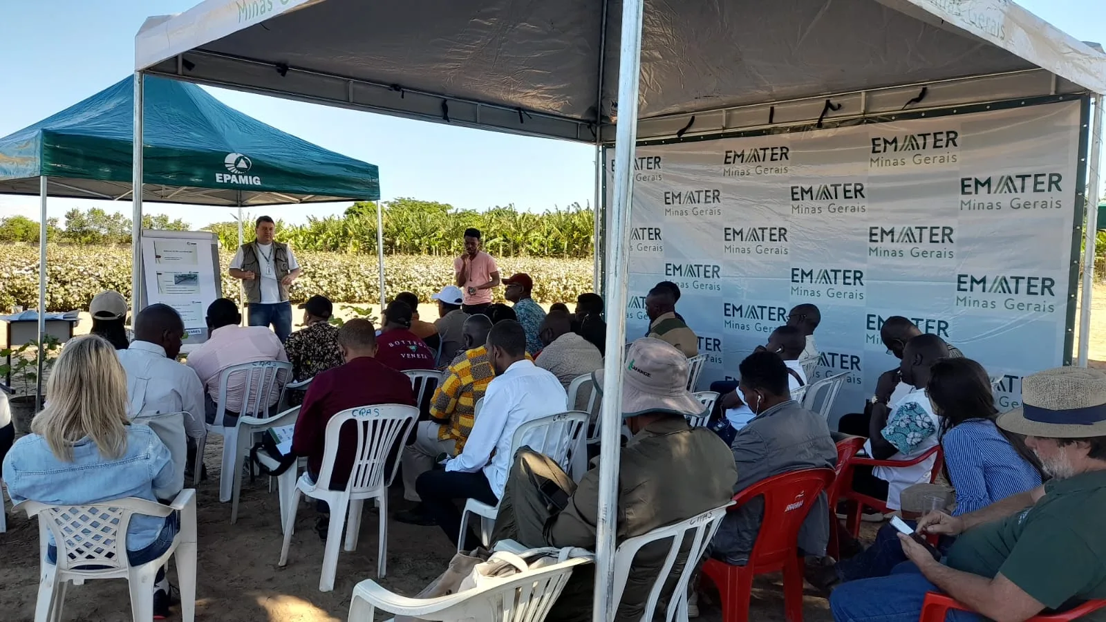No dia de campo, exclusivo para a delegação de países africanos, pesquisadores da EPAMIG Maurício Mendes, João Batista Ribeiro Silva Reis, Antônio Cláudio Ferreira da Costa e Alniusa Maria de Jesus abordaram, respectivamente, os temas Parâmetros fitotécnicos do algodoeiro; Irrigação; Manejo integrado de insetos-pragas, e nematoides fitoparasitas da cultura do algodoeiro. E profissionais da Emater-MG falaram sobre a Implantação de uma Unidade Técnico Demonstrativa e sobre aplicação segura de defensivos.