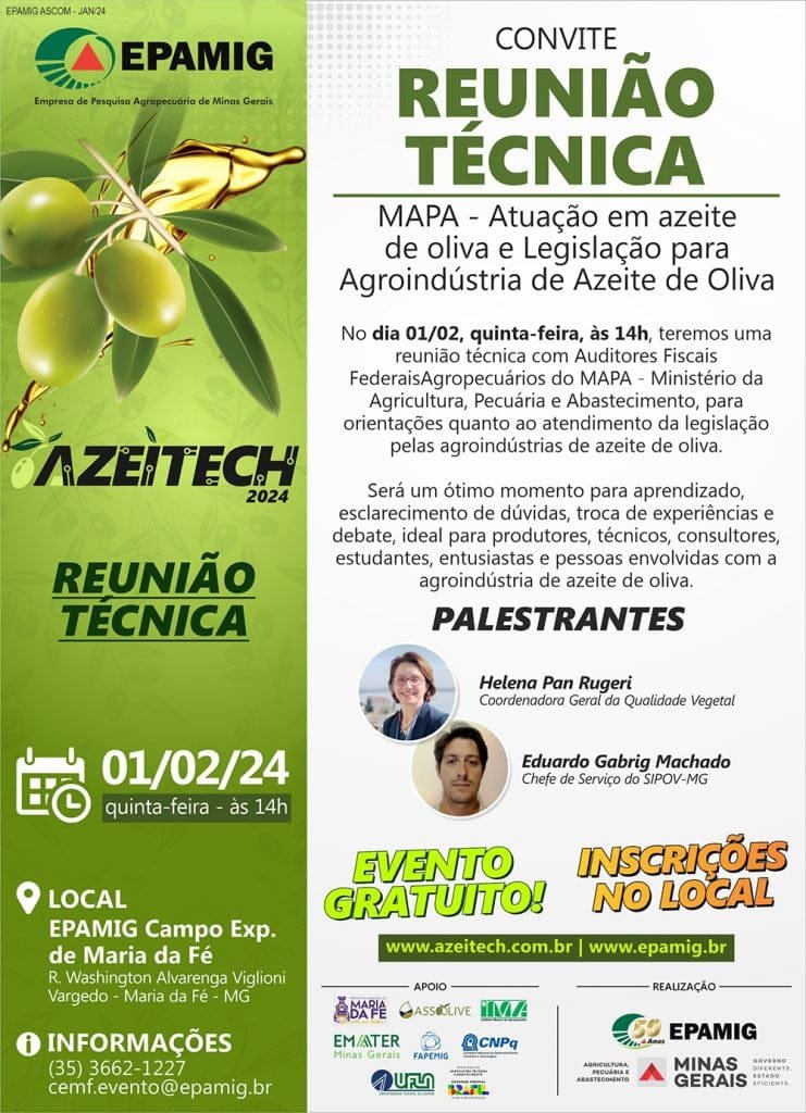 “Acreditamos que será muito proveitoso realizar essa reunião, na véspera do Azeitech, para que os produtores possam saber mais sobre os protocolos e sistemas de registro do Mapa, bem como as normas sanitárias adequadas para a produção de azeite em suas agroindústrias”, comenta o pesquisador da EPAMIG, e membro da comissão organizadora do Azeitech 2024, Pedro Henrique Moura.