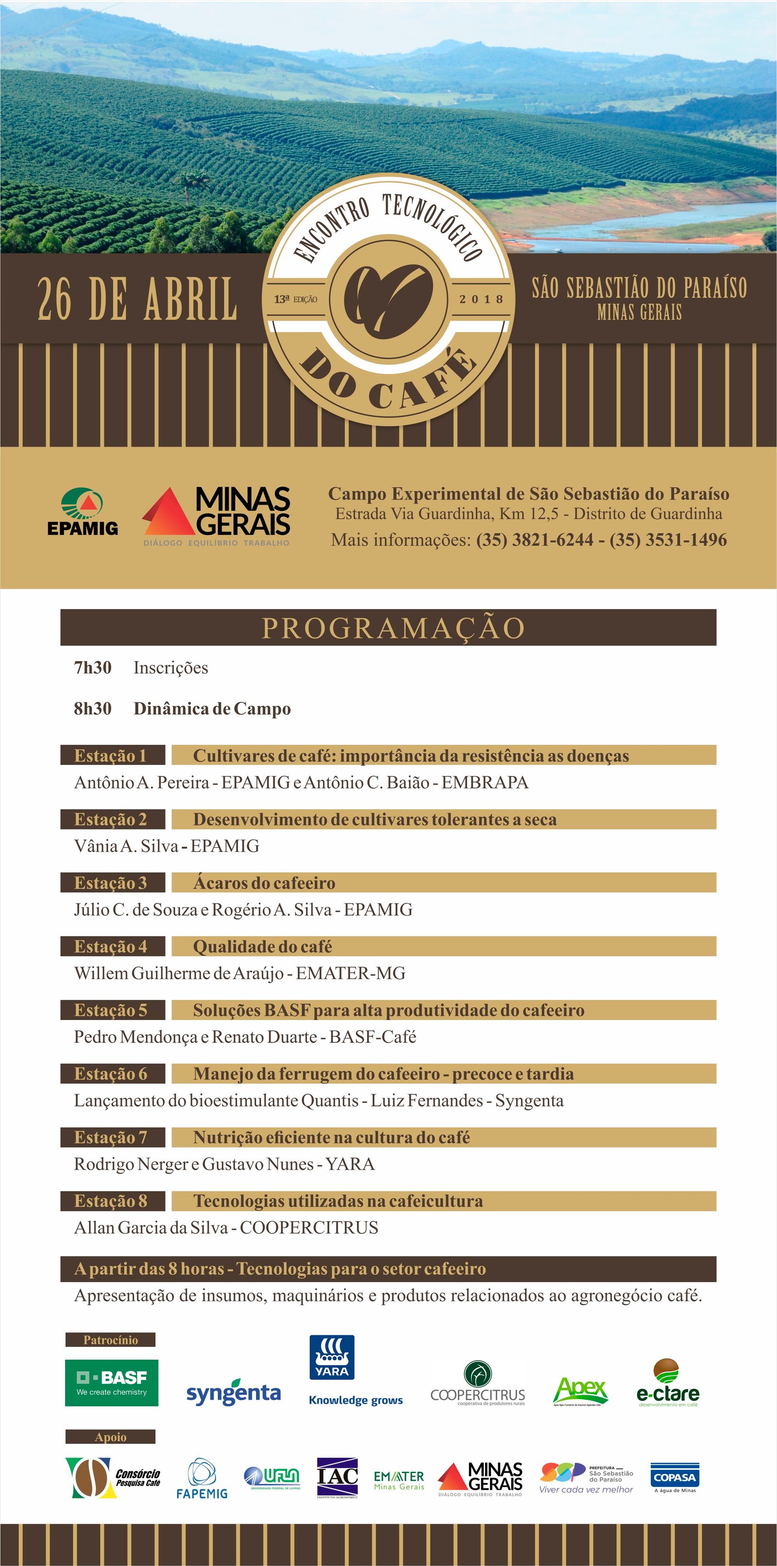 (Belo Horizonte, 18/4/2018) Extensionistas, técnicos e cafeicultores poderão participar no dia 26 de abril (quinta-feira) do 13º Encontro Tecnológico do Café, organizado pela Empresa de Pesquisa Agropecuária de Minas Gerais (EPAMIG). O evento acontece no Campo Experimental da EPAMIG em São Sebastião do Paraíso.
