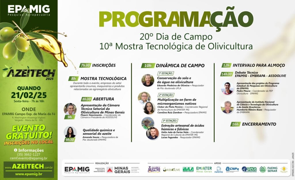 A EPAMIG irá realizar o Azeitech 2025, evento gratuito marcado para o dia 21 de fevereiro, no Campo Experimental de Maria da Fé. A programação tem como tema central “práticas agrícolas sustentáveis e agricultura regenerativa”.
