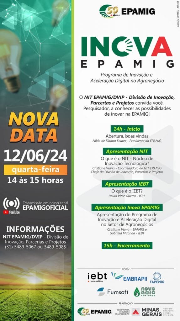(Belo Horizonte – 5/6/2024) A Empresa de Pesquisa Agropecuária de Minas Gerais (EPAMIG) realiza na próxima quarta-feira, 12 de junho, às 14h, o lançamento do Programa de Inovação e Aceleração Digital do Agronegócio, Inova EPAMIG. A apresentação terá transmissão pelo Canal Oficial no YouTube.