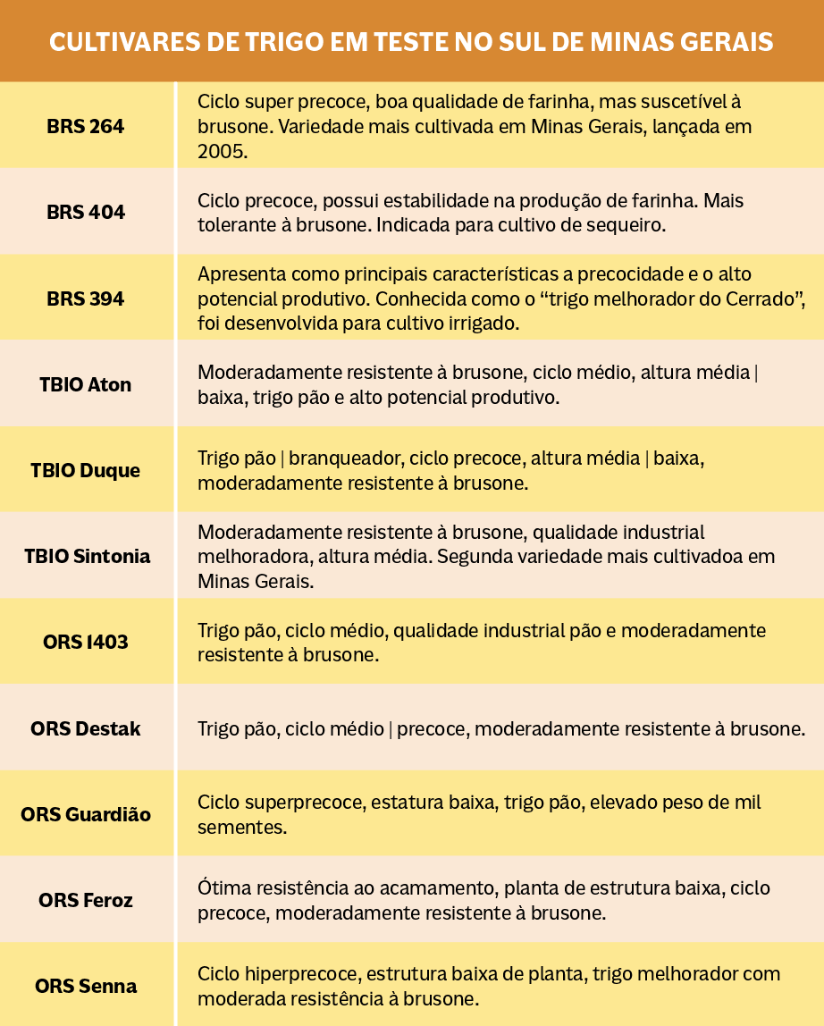 Há mais de dez anos essas empresas tem atuado no incentivo ao plantio de trigo na entressafra e na rotação de culturas em Minas Gerais. Além disso, um projeto da EPAMIG quer diversificar as cultivares de trigos plantadas na região Sul do estado. O objetivo das pesquisas é apresentar aos agricultores opções de trigo mais produtivos, com mais sanidade e com qualidade de farinha igual ou superior as plantadas na região.