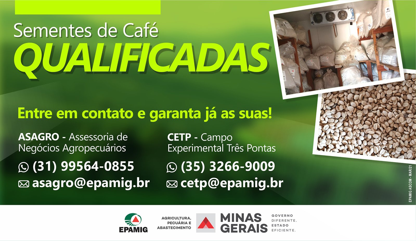 (Três Pontas – 23/3/2021) A Empresa de Pesquisa Agropecuária de Minas Gerais (EPAMIG), por meio do Campo Experimental de Três Pontas, está comercializando sementes qualificadas de café para entrega imediata. Os materiais oferecidos são das cultivares Topázio MG1190, Catuaí Vermelho IAC 144 e IAC 99 e Mundo Novo IAC 379/19 e IAC 376/4 e podem ser adquiridos nos meses de março e abril, por R$35, o quilo. Os pedidos podem ser feitos por e-mail cetp@epamig.site ou telefone (35) 3266-9009.