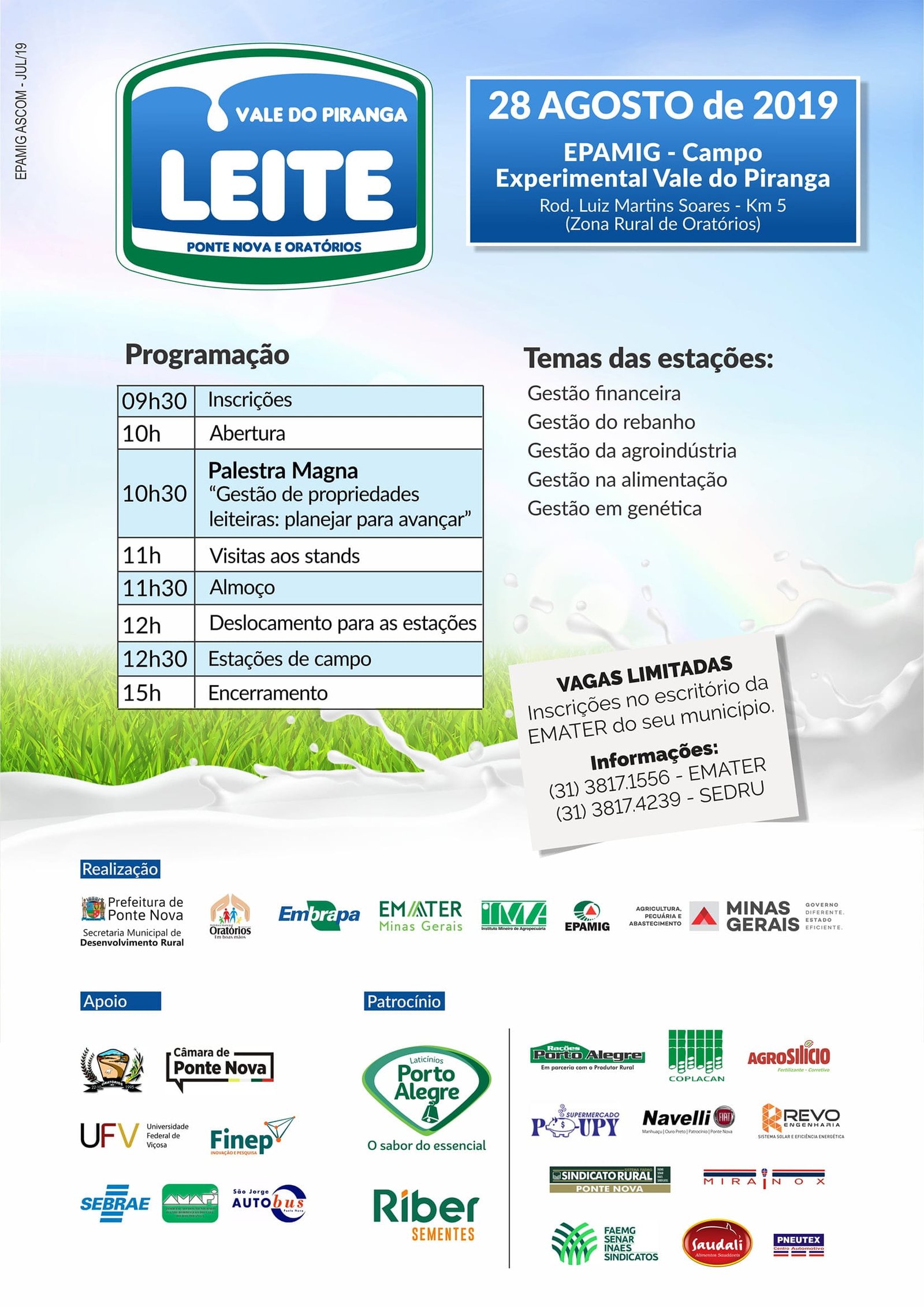 Em caso de dúvidas, mais informações sobre o Vale do Piranga Leite pelos telefones (31) 3817-1556 ou (31) 3817-4239. O evento é uma realização da EPAMIG, Emater-MG, IMA, Embrapa e Prefeitura de Ponte Nova. A EPAMIG é uma empresa vinculada à Secretaria de Agricultura, Pecuária e Abastecimento de Minas Gerais.