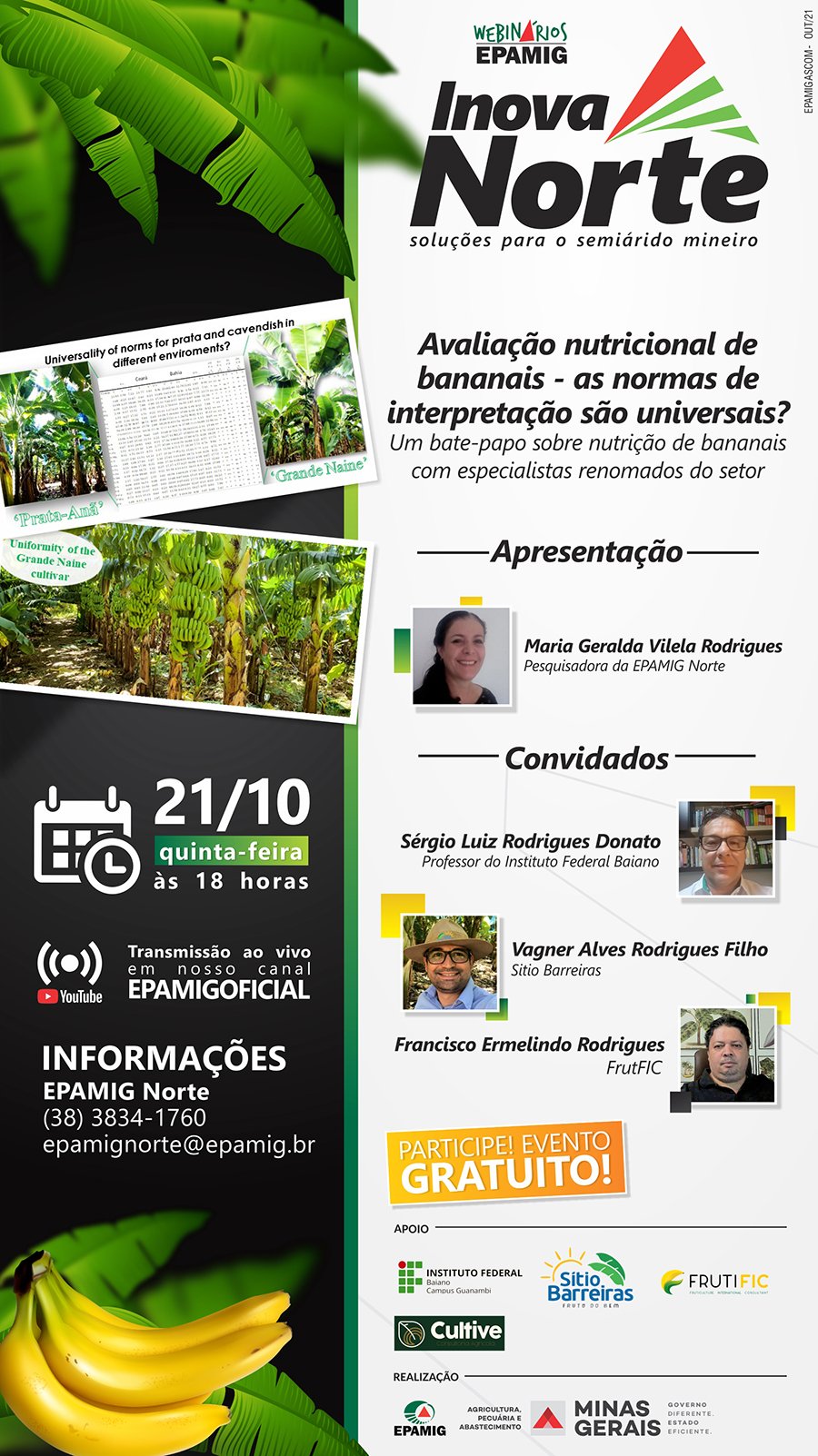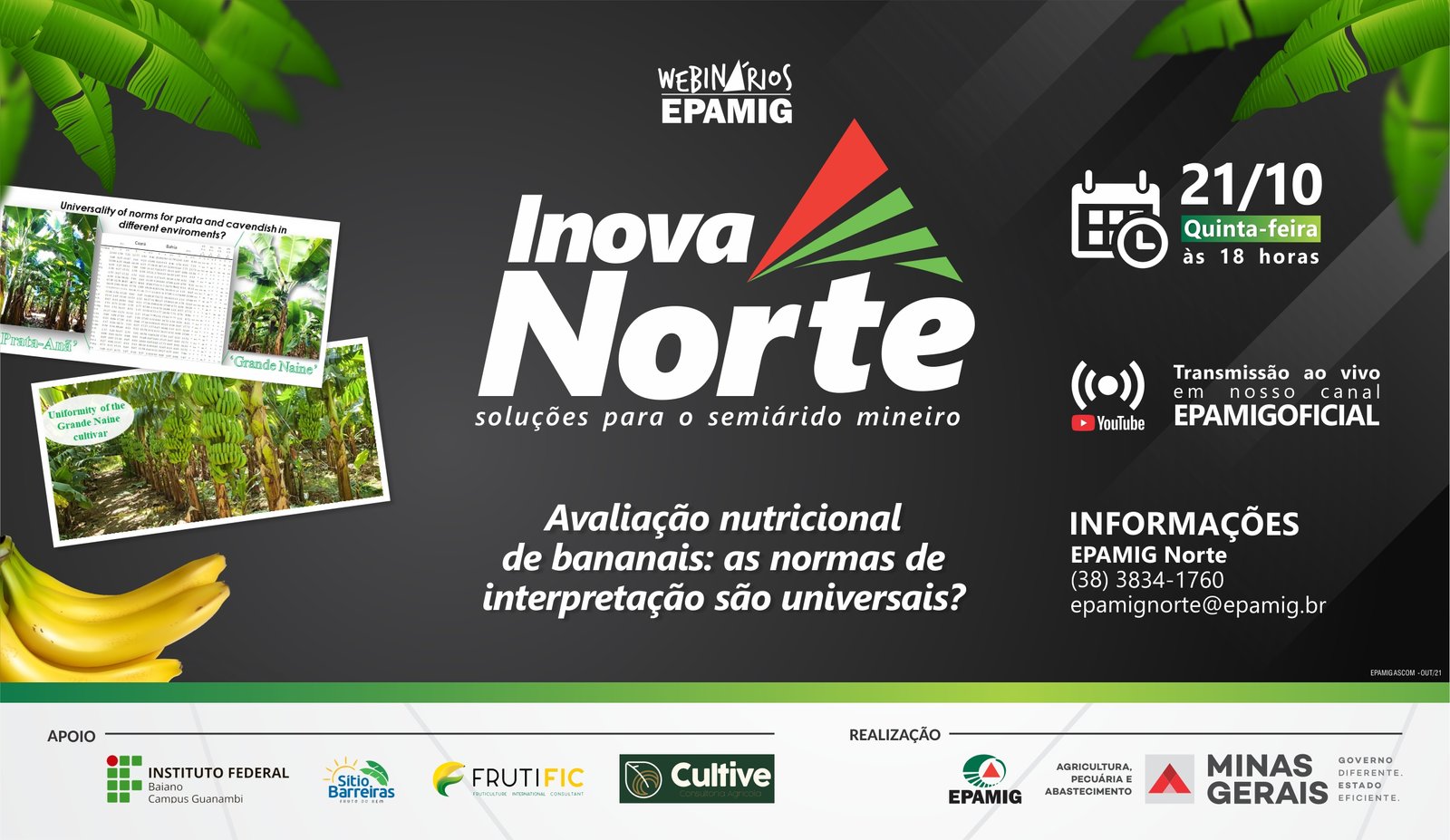 (Belo Horizonte –19/10/2021) – A Empresa de Pesquisa Agropecuária de Minas Gerais (EPAMIG) realiza na próxima quinta-feira, 21 de outubro, às 18h, mais uma edição do Inova Norte. O evento online terá como tema “Avaliação Nutricionais dos bananais”. A transmissão será pelo Canal Oficial da Empresa no YouTube.