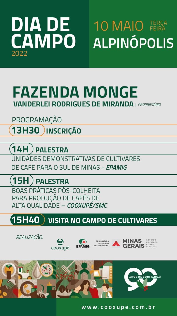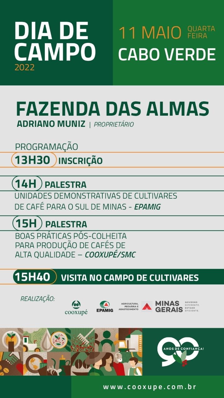 No dia 10 de maio, terça-feira, a partir das 13h30, o encontro acontece na Fazenda Monge, em Alpinópolis. No dia 11, no mesmo horário, as atividades serão na Fazenda das Almas, em Cabo Verde. “A programação é bastante similar nas duas datas. Teremos uma estação da EPAMIG, na qual apresentaremos os resultados de produtividade e qualidade de bebida obtidos por cultivar nas diferentes Unidades Demonstrativas neste primeiro triênio de avaliação e as projeções para a próxima safra. E uma estação da Cooxupé com destaque para as ações da Cooperativa voltadas para a produção de cafés especiais. Para terminar, haverá um giro nas unidades demonstrativas, nas quais será possível observar o desempenho das cultivares em campo”, adianta o pesquisador da EPAMIG César Botelho.