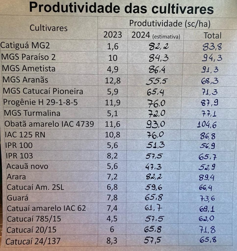 “Aqui eles possuem um sistema de manejo diferenciado e muito próprio, conseguiram uma safra com 18 meses e já vão para a segunda colheita”, aponta Vinícius Andrade. “O potencial produtivo variou de pouco mais de 50 sacas para as cultivares menos produtivas, o que já são números excelentes, até 100 sacas por hectare”, acrescenta Dominghetti.