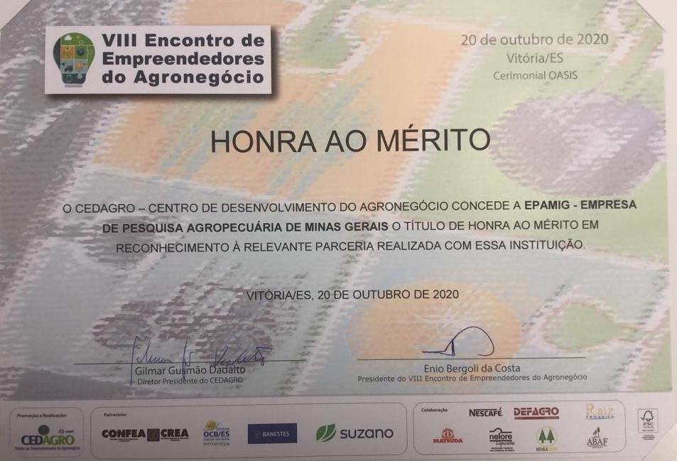 Durante o encontro, houve homenagens a instituições de destaque no cenário do agronegócio brasileiro que possuem projetos em parceria com o Cedagro. A Empresa de Pesquisa Agropecuária de Minas Gerais (EPAMIG) foi homenageada na modalidade “Honra ao Mérito”. O Diretor de Operações Técnicas, Trazilbo de Paula, compareceu ao encontro e representou a EPAMIG na cerimônia de entrega do prêmio.
