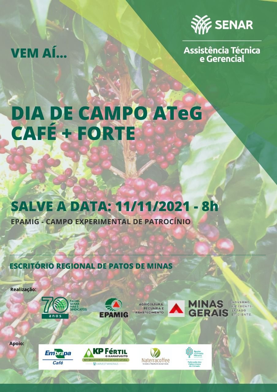 (Patrocínio – 28/10/2021) O Programa de Assistência Técnica e Gerencial (ATeG) do Sistema Faemg/Senar/Inaes e a Empresa de Pesquisa Agropecuária de Minas Gerais (EPAMIG) realizam no próximo dia 11 de novembro, às 8h, o Dia de Campo ATeG Café+Forte. O evento, presencial, será realizado no Campo Experimental da EPAMIG em Patrocínio.