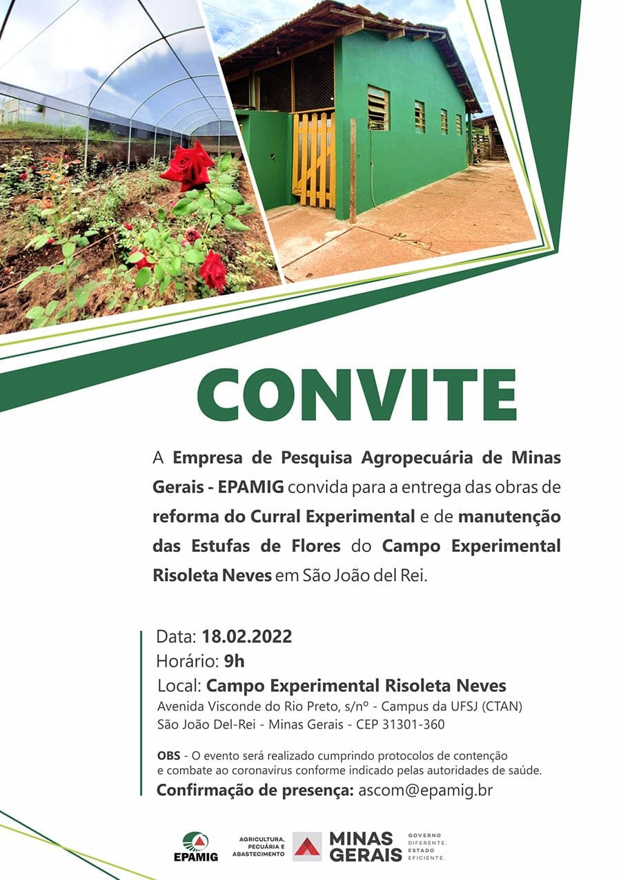 (Belo Horizonte – 15/2/2022) A Empresa de Pesquisa Agropecuária de Minas Gerais (EPAMIG) promove na próxima sexta-feira, 18 de fevereiro, a entrega de obras estruturais realizadas no Campo Experimental Risoleta Neves, em São João del-Rei. As melhorias incluem a reforma no piso e no revestimento das estruturas que atendem ao curral experimental e a manutenção de 10 estufas de flores.