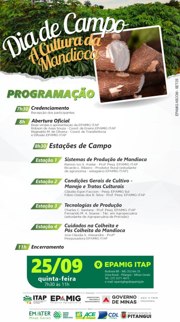 (Belo Horizonte, 17/9/2025) O Instituto Tecnológico de Agropecuária de Pitangui, vinculado à Empresa de Pesquisa Agropecuária de Minas Gerais (EPAMIG ITAP), promove a 1ª edição do Dia de Campo “A cultura da Mandioca”. O evento, que visa fortalecer a atividade produtiva e atuar na difusão de conhecimentos e técnicas, será realizado no dia 25 de setembro, quinta-feira, das 7h30 às 11h, na sede da EPAMIG ITAP, em Pitangui-MG.
