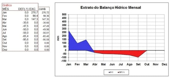 Gráfico 1 – Balanço Hídrico em Três Pontas, MG. Calculado por meio de Rolin et al. (1998). CAD de 100 mm.