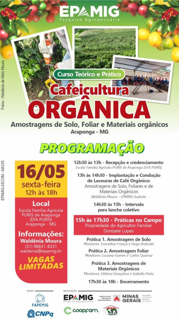 (Belo Horizonte, 12/5/2025) – A Empresa de Pesquisa Agropecuária de Minas Gerais (EPAMIG) promove, na sexta-feira, 16 de maio, o curso “Cafeicultura Orgânica – Amostragens do Solo, Foliar e Materiais Orgânicos”. O evento será realizado das 12h às 18h, no município de Araponga-MG.