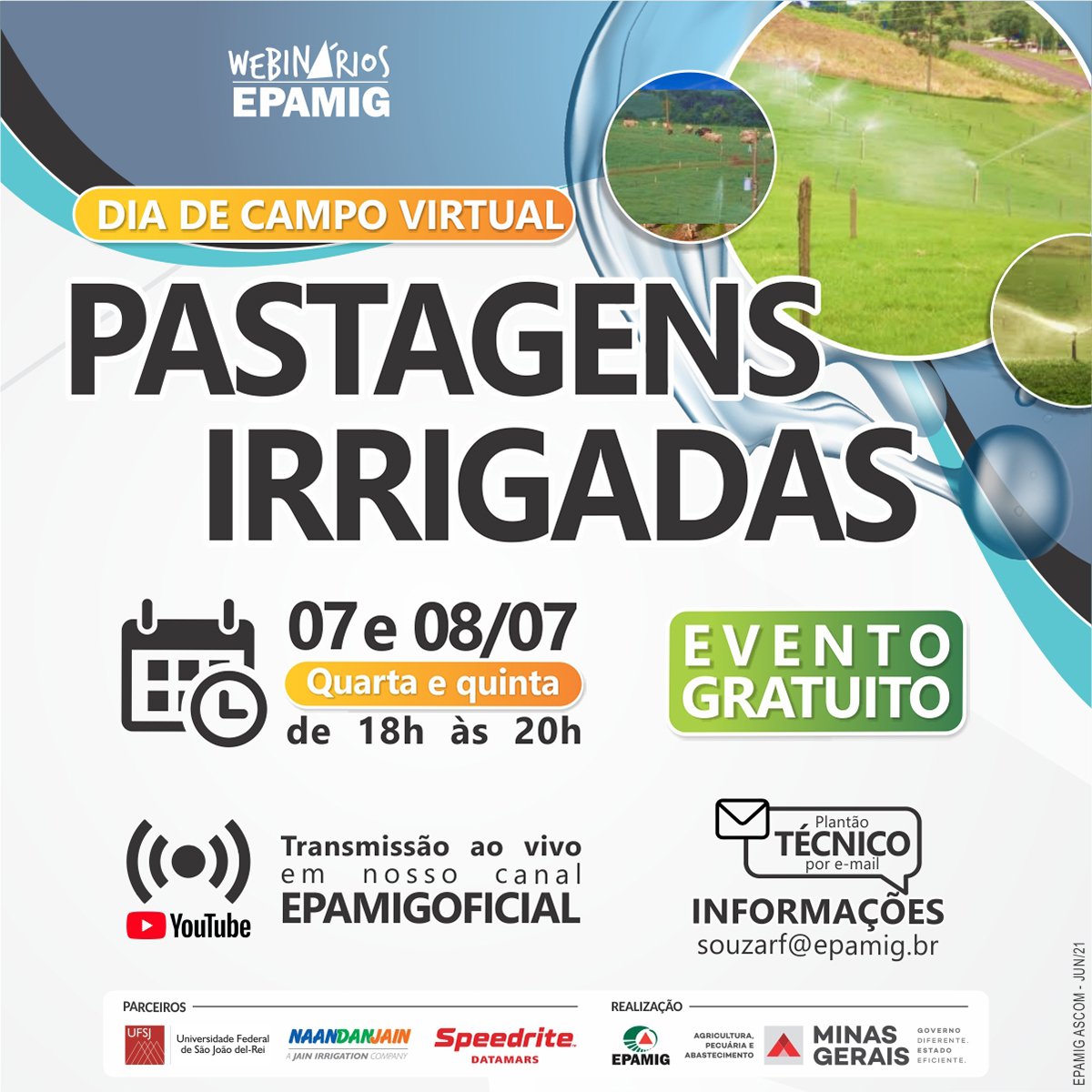(Belo Horizonte – 30/6/2021) – A Empresa de Pesquisa Agropecuária de Minas Gerais (EPAMIG) promove nos dias 7 e 8 de julho, quarta e quinta-feira da próxima semana, a partir das 18h, o Dia de Campo Virtual “Pastagens Irrigadas”. O evento será transmitido ao vivo pelo Canal Oficial da Empresa no YouTube.