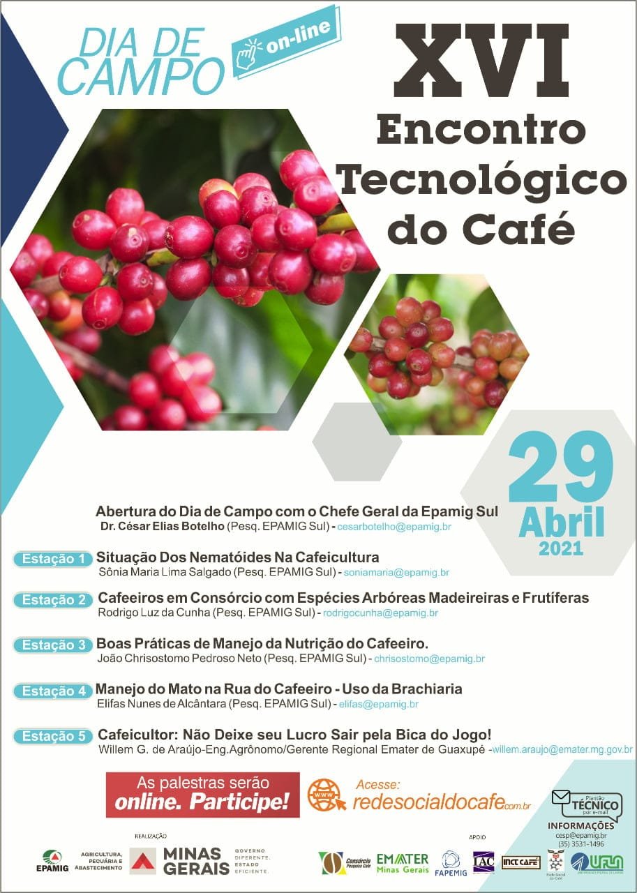(Belo Horizonte – 26/4/2021) – A Empresa de Pesquisa Agropecuária de Minas Gerais (EPAMIG) realiza no próximo dia 29 de abril (quinta-feira), a 16a. edição do Encontro Tecnológico do Café. Pelo segundo ano consecutivo, o evento, que tradicionalmente acontece no Campo Experimental da Empresa em São Sebastião do Paraíso (Sul de Minas), será online com conteúdo disponibilizado pela Rede Social do Café.