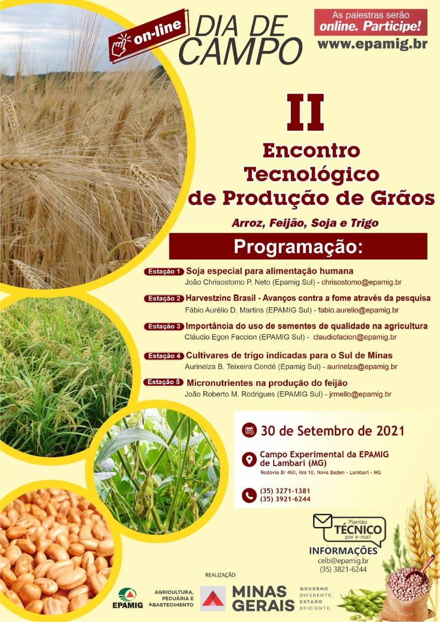 (Lambari – 27/9/2021) – A Empresa de Pesquisa Agropecuária de Minas Gerais (EPAMIG) realiza na quinta-feira, 30 de setembro, o 2º. Encontro Tecnológico de Produção de Grãos. A série de palestras online vai destacar as culturas de arroz, feijão, trigo e milho. O conteúdo será disponibilizado pelo Canal Oficial da Empresa no YouTube, a partir das 10h.