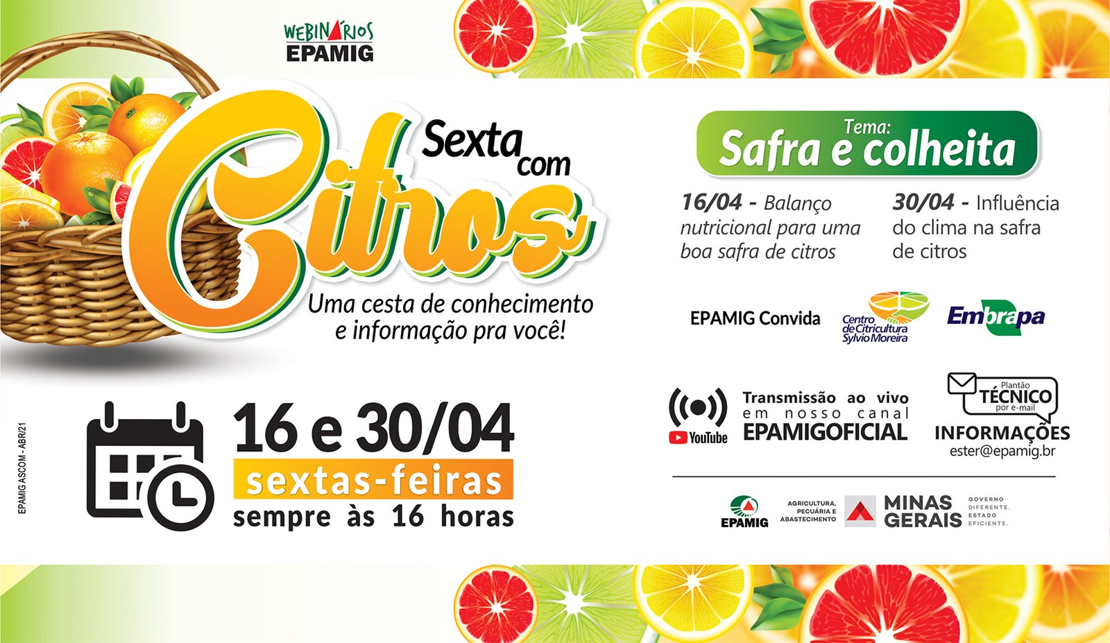 (Belo Horizonte – 12/4/2021) – A Empresa de Pesquisa Agropecuária de Minas Gerais (EPAMIG) realiza nesta mês de abril duas edições da série de webinários ‘Sexta com Citros”. Os encontros, que serão transmitidos pelo Canal EPAMIG Oficial no Youtube, acontecem nos dias 16 e 30 de abril e vão discutir safra e colheita.