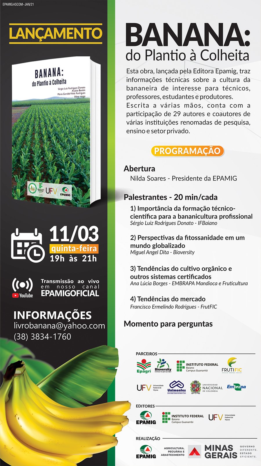 O lançamento da obra vai ocorrer no dia 11 de março (quinta-feira), às 19h, no canal da EPAMIG no YouTube. A programação conta com falas sobre a formação técnico-científica voltada para bananicultura profissional, perspectivas para um mundo globalizado e tendências do mercado de banana. O evento online não requer inscrições prévias.