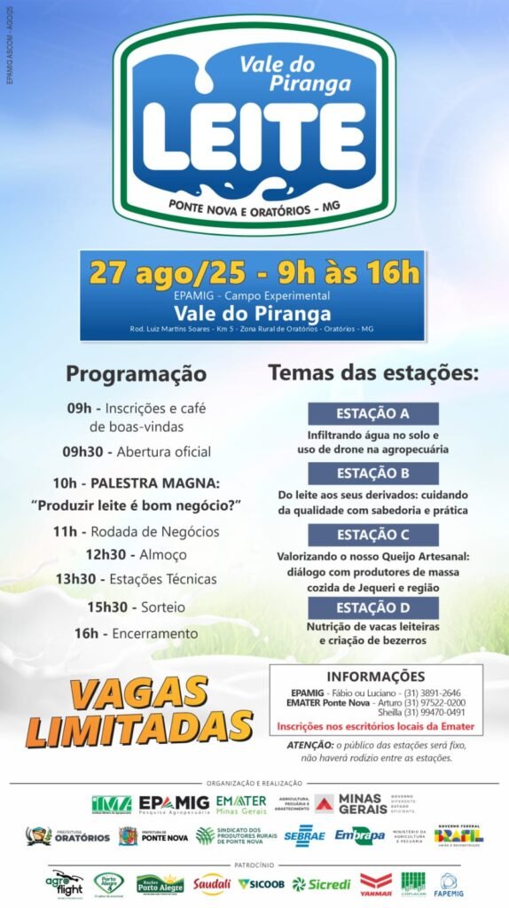 (Belo Horizonte – 19/8/2025) A Empresa de Pesquisa Agropecuária de Minas Gerais (EPAMIG) realiza, na quarta-feira, 27 de agosto, a 10ª edição do Vale do Piranga Leite. O evento acontece no Campo Experimental Vale do Piranga, em Oratórios-MG, entre 9h e 16h.