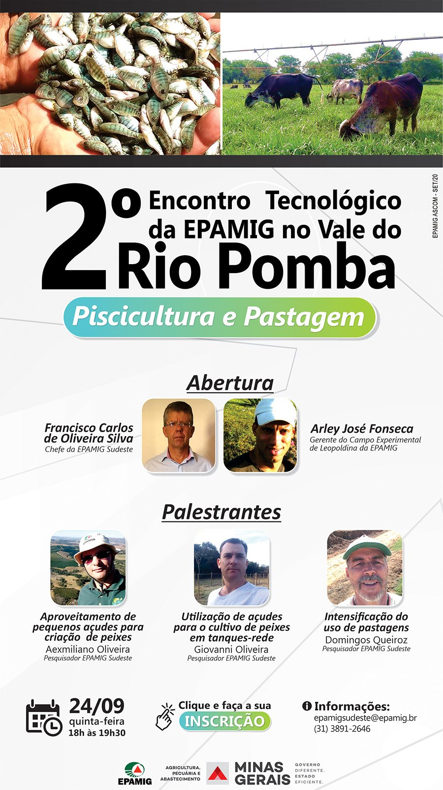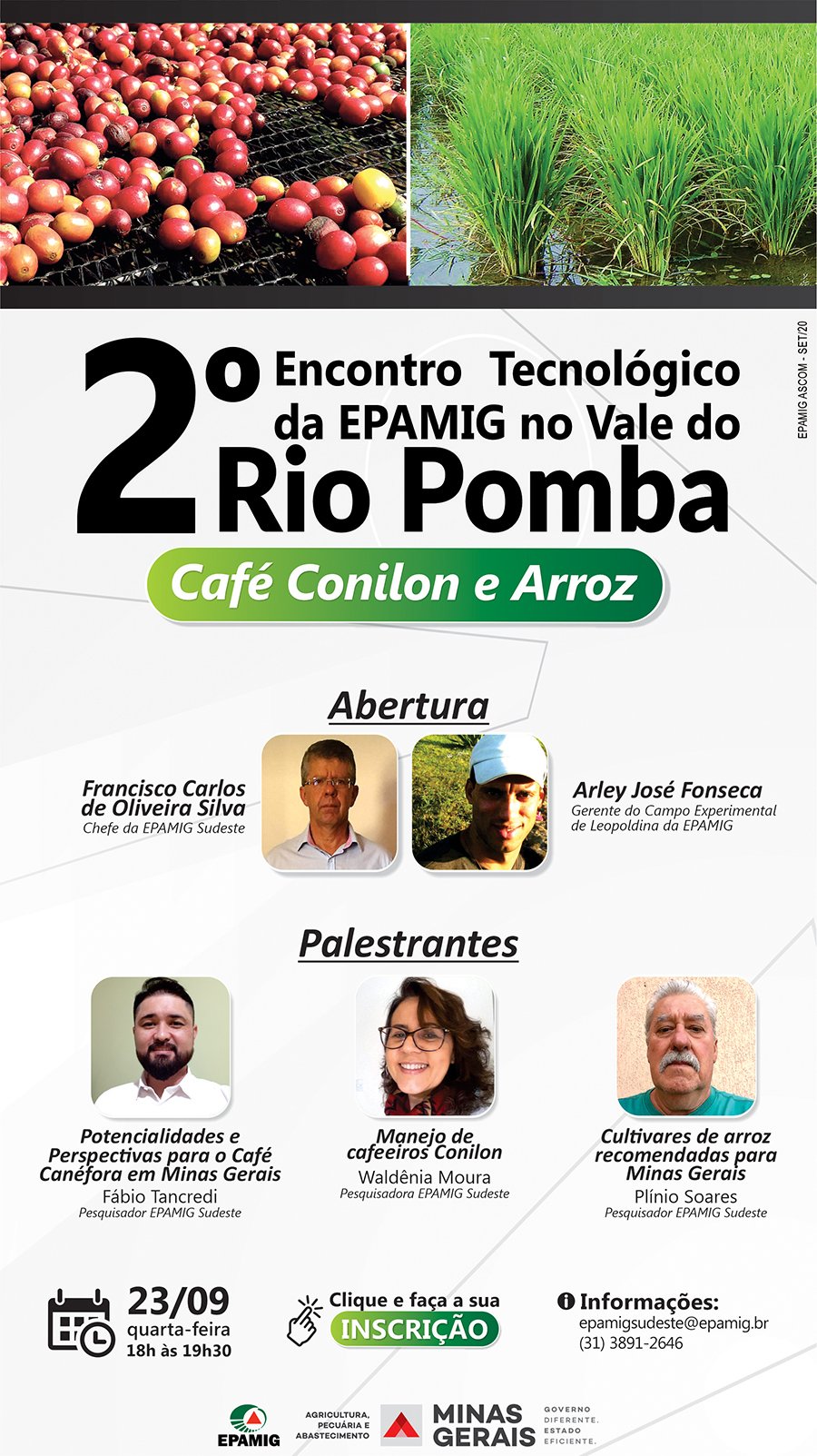 (Viçosa – 16/9/2020) A Empresa de Pesquisa Agropecuária de Minas Gerais (EPAMIG) realizará nos dias 23 e 24 de setembro, por meio de webinar, a 2º edição do Encontro Tecnológico no Vale do Rio Pomba. A programação abordará temas como as potencialidades do café canéfora, a produção sustentável do café conilon, cultivares de arroz, além de compartilhar resultados sobre intensificação de pastagens e manejo produtivo na piscicultura. O evento acontecerá das 18h às 19h30 e as inscrições podem ser feitas no site (clique aqui).
