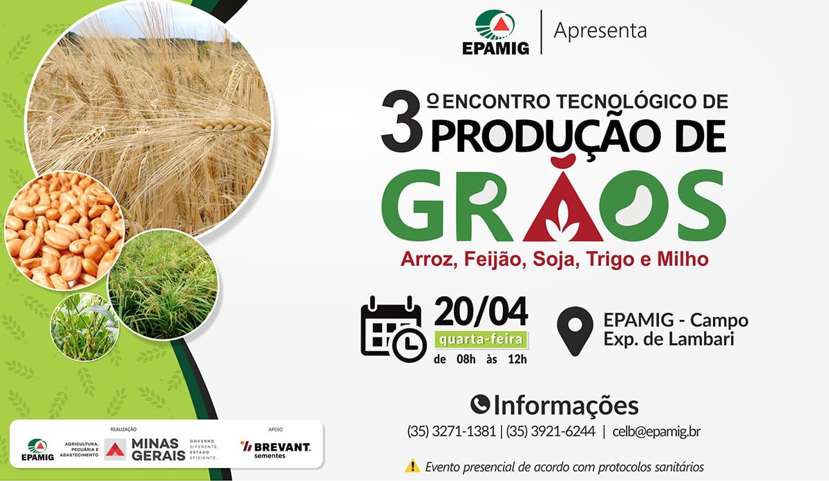 (Lambari – 5/4/2022) A Empresa de Pesquisa Agropecuária de Minas Gerais (EPAMIG) vai realizar o 3º Encontro Tecnológico de Produção de Grãos. O evento, presencial e gratuito, ocorrerá no dia 20 de abril, de 8h às 12h, no Campo Experimental da EPAMIG de Lambari (MG). As inscrições serão realizadas no dia e no local do evento.