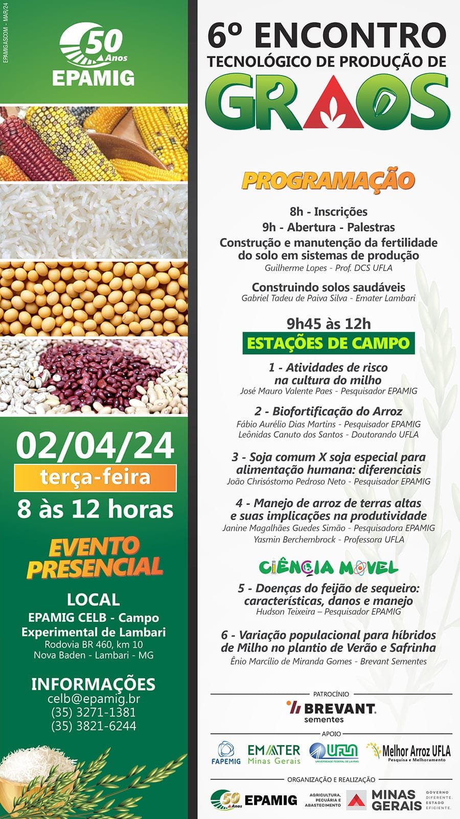 (Lambari – 25/3/2024) A Empresa de Pesquisa Agropecuária de Minas Gerais (EPAMIG) realiza, no dia 2 de abril, a partir das 8h, o 6º Encontro Tecnológico de Produção de Grãos. O evento, gratuito e presencial, ocorrerá no Campo Experimental da Empresa em Lambari (MG), com estações de campo abordando pesquisas e novas tecnologias para o cultivo de soja, milho, arroz e feijão no Sul do estado.