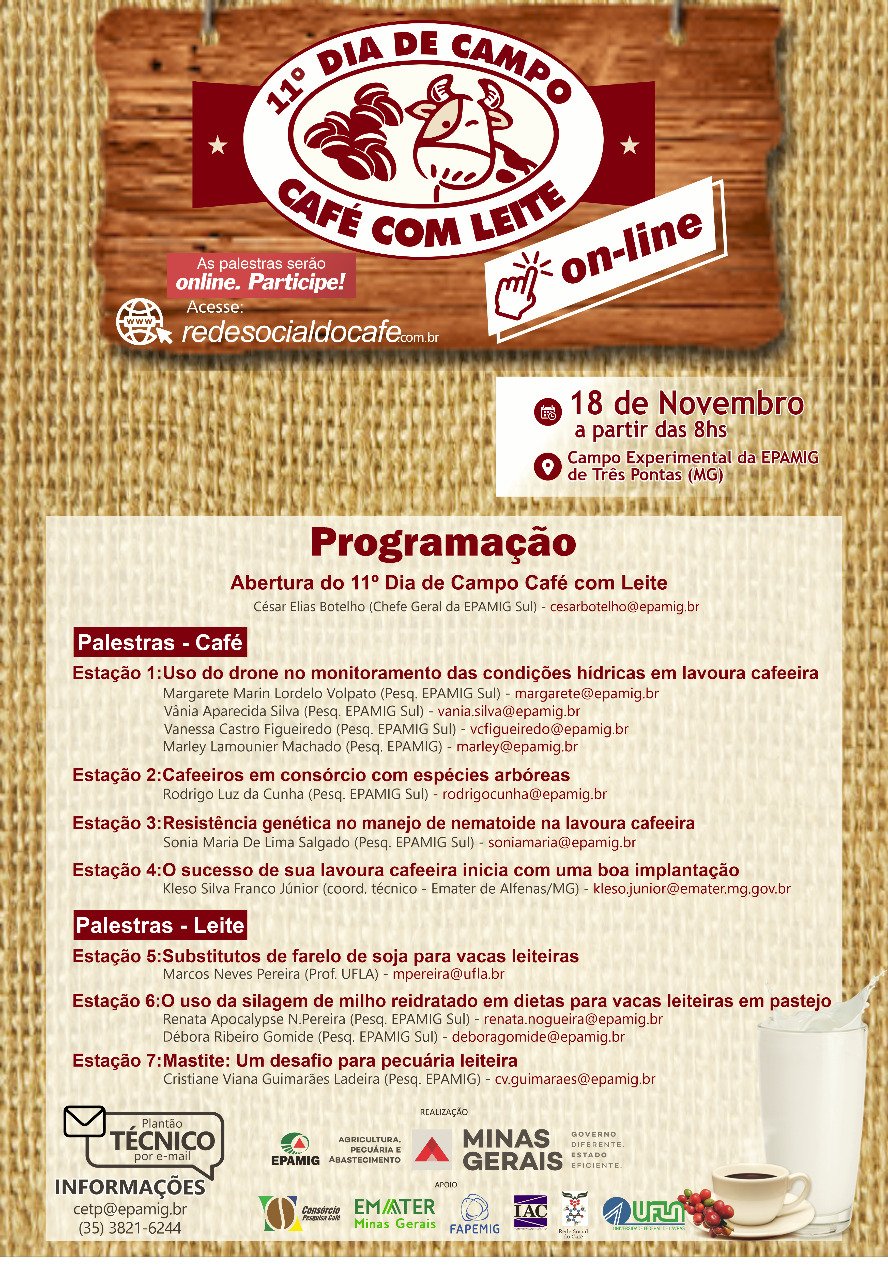 (Três Pontas – 16/11/2021) A Empresa de Pesquisa Agropecuária de Minas Gerais (EPAMIG) realiza na próxima quinta-feira, 18 de novembro, o 11º dia de campo Café com Leite. Pelo segundo ano consecutivo, o evento que acontece no Campo Experimental de Três Pontas, será totalmente virtual. As estações serão disponibilizadas pela Rede Social do Café, a partir das 8h.