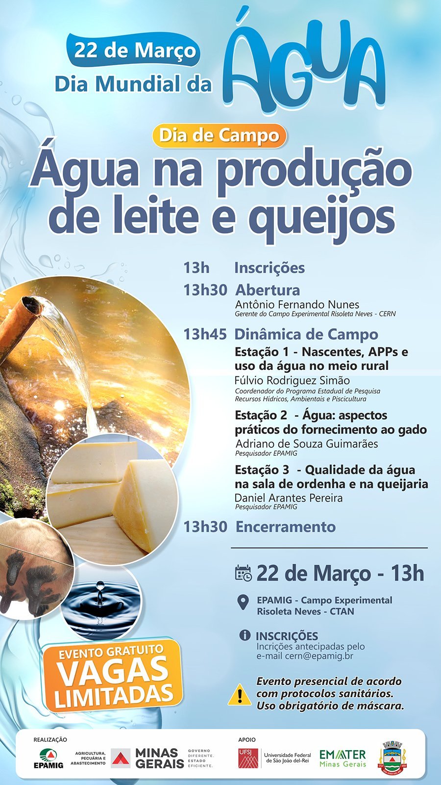 (São João del-Rei – 15/3/2022) A Empresa de Pesquisa Agropecuária de Minas Gerais (EPAMIG) promove na próxima terça-feira, 22 de março, às 13h, o Dia de Campo “Água na produção de leite e queijos”. O evento, em comemoração ao Dia Mundial da Água, será realizado no Campo Experimental Risoleta Neves, em São João del-Rei. As atividades presenciais vão atender aos protocolos sanitários vigentes para o controle da Covid-19.