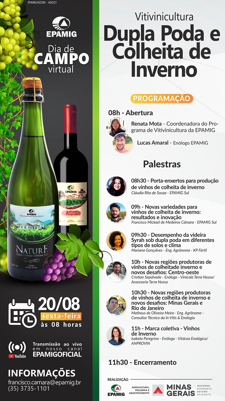 A abertura do Dia de Campo virtual será realizada às 8h pela coordenadora do Programa de Pesquisa em Vitivinicultura da EPAMIG, Renata Mota, e pelo enólogo da empresa, Lucas Amaral. Em seguida, às 8h30, a pesquisadora da EPAMIG, Cláudia Rita de Souza, vai conduzir uma discussão sobre porta-enxertos para produção de vinhos de colheita de inverno.