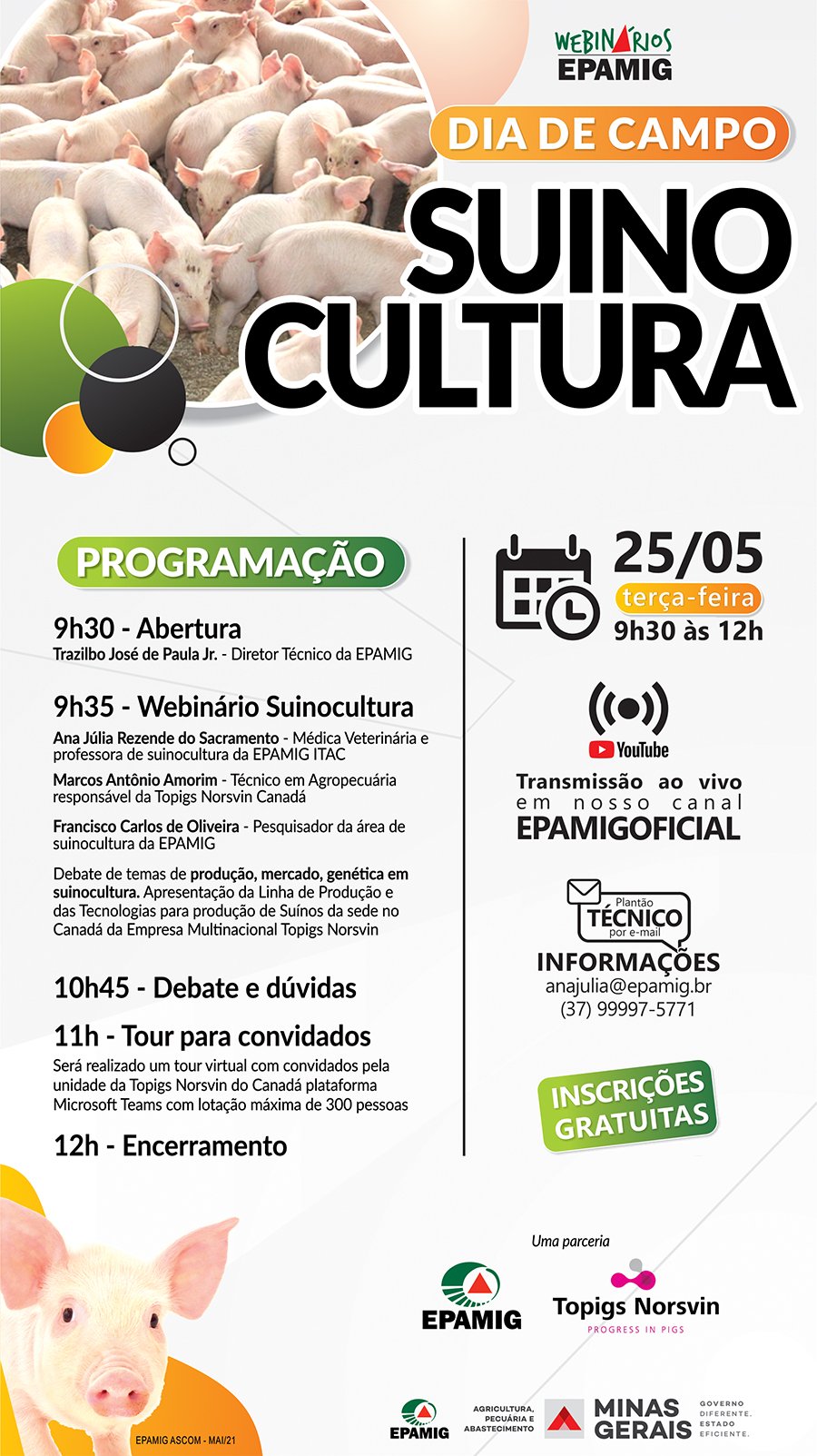(Belo Horizonte – 20/5/2021) A Empresa de Pesquisa Agropecuária de Minas Gerais (EPAMIG) realiza no próximo dia 25 de maio, (terça-feira), de 9h30 às 12h, um Dia de Campo virtual sobre suinocultura. O evento, gratuito, será transmitido ao vivo no canal da EPAMIG no YouTube. Para participar é necessário fazer inscrição (clique aqui).
