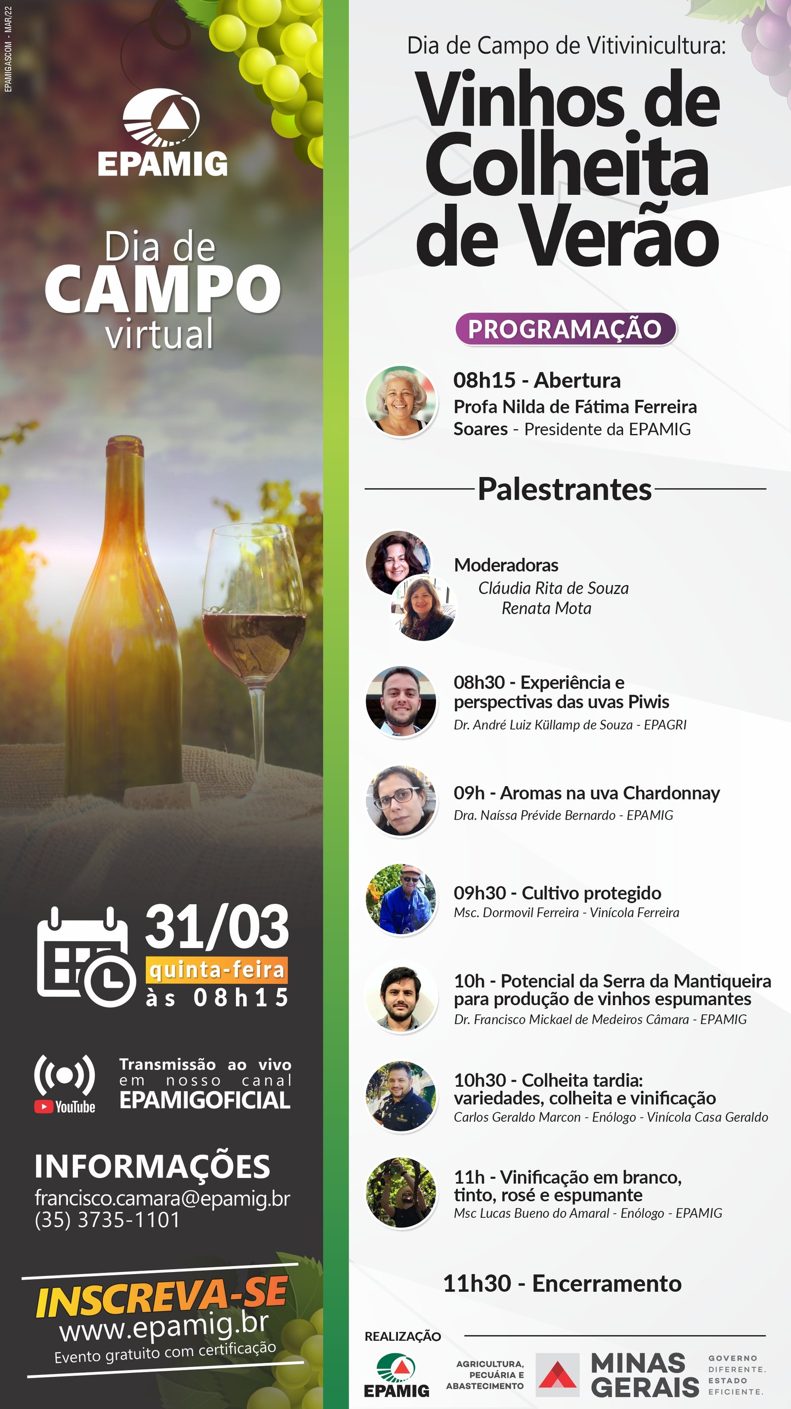 (Caldas – 24/3/2022) A Empresa de Pesquisa Agropecuária de Minas Gerais (EPAMIG) vai realizar mais um Dia de Campo gratuito sobre vitivinicultura. O tema da vez será a produção de vinhos de colheita de verão. O evento virtual vai ocorrer no dia 31 de março, quinta-feira, a partir das 8h15, com transmissão ao vivo pelo canal da EPAMIG no Youtube (clique aqui). Para participar é necessário fazer inscrição (clique aqui).