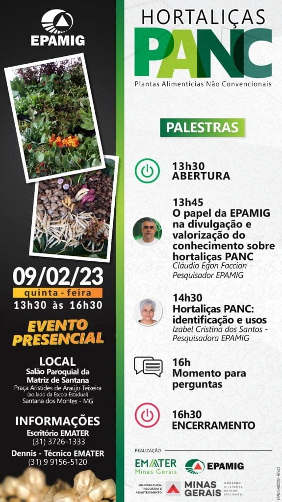 (Santana dos Montes – 7/2/2023) Considerado um município de alto fluxo turístico, Santana dos Montes (MG) recebe, na próxima quinta-feira (9/02), a partir das 13h30, palestras com pesquisadores da Empresa de Pesquisa Agropecuária de Minas Gerais (EPAMIG), sobre as hortaliças PANC, acrônimo para Plantas Alimentícias Não Convencionais. O evento gratuito e presencial é realizado em parceria com a Empresa de Assistência Técnica e Extensão Rural de Minas Gerais (Emater-MG) e ocorrerá no Salão Paroquial da Matriz de Santana. Segundo uma das palestrantes, a pesquisadora da EPAMIG Sul, Izabel Cristina dos Santos, o objetivo principal do encontro é incentivar os produtores locais a começarem a cultivar as hortaliças PANC, vendê-las para restaurantes de pousadas locais e, assim, diversificarem suas atividades econômicas, gerando mais renda para suas propriedades.