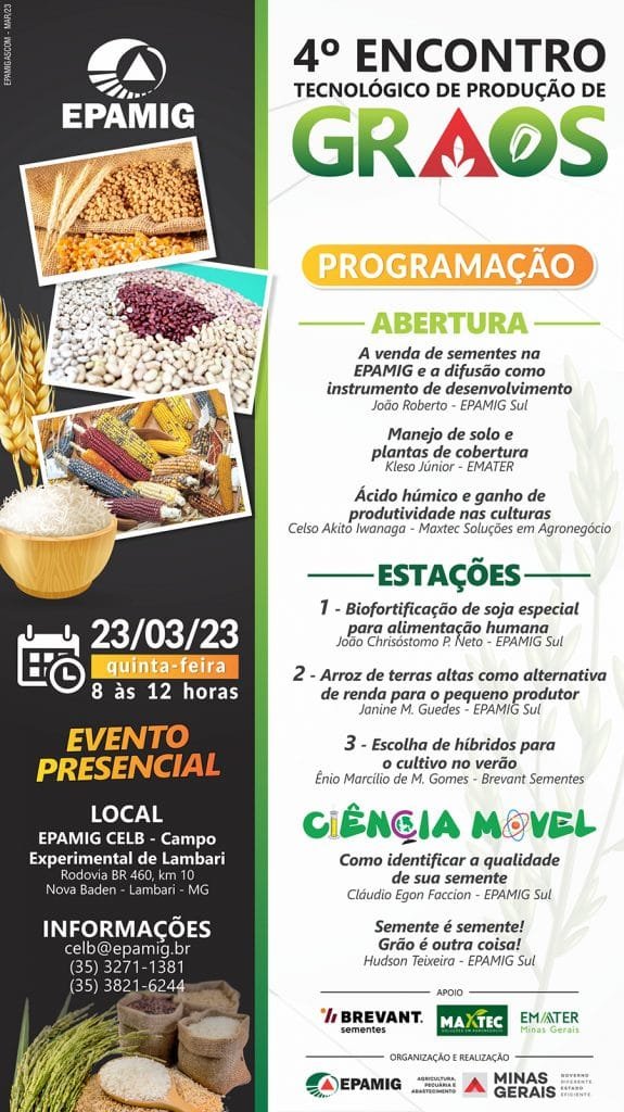 (Lambari – 21/3/2023) Arroz, milho e soja são culturas que têm crescido de forma considerável no sul de Minas Gerais. Isso porque a região está localizada em altitudes mais elevadas e conta com características climáticas favoráveis à produção de grãos. Com o intuito de difundir tecnologias e conhecimentos sobre os cultivos desses alimentos, a Empresa de Pesquisa Agropecuária de Minas Gerais (EPAMIG) realiza o 4º Encontro Tecnológico de Produção de Grãos, que ocorrerá no Campo Experimental de Lambari (MG), no dia 23 de março, a partir das 8h.