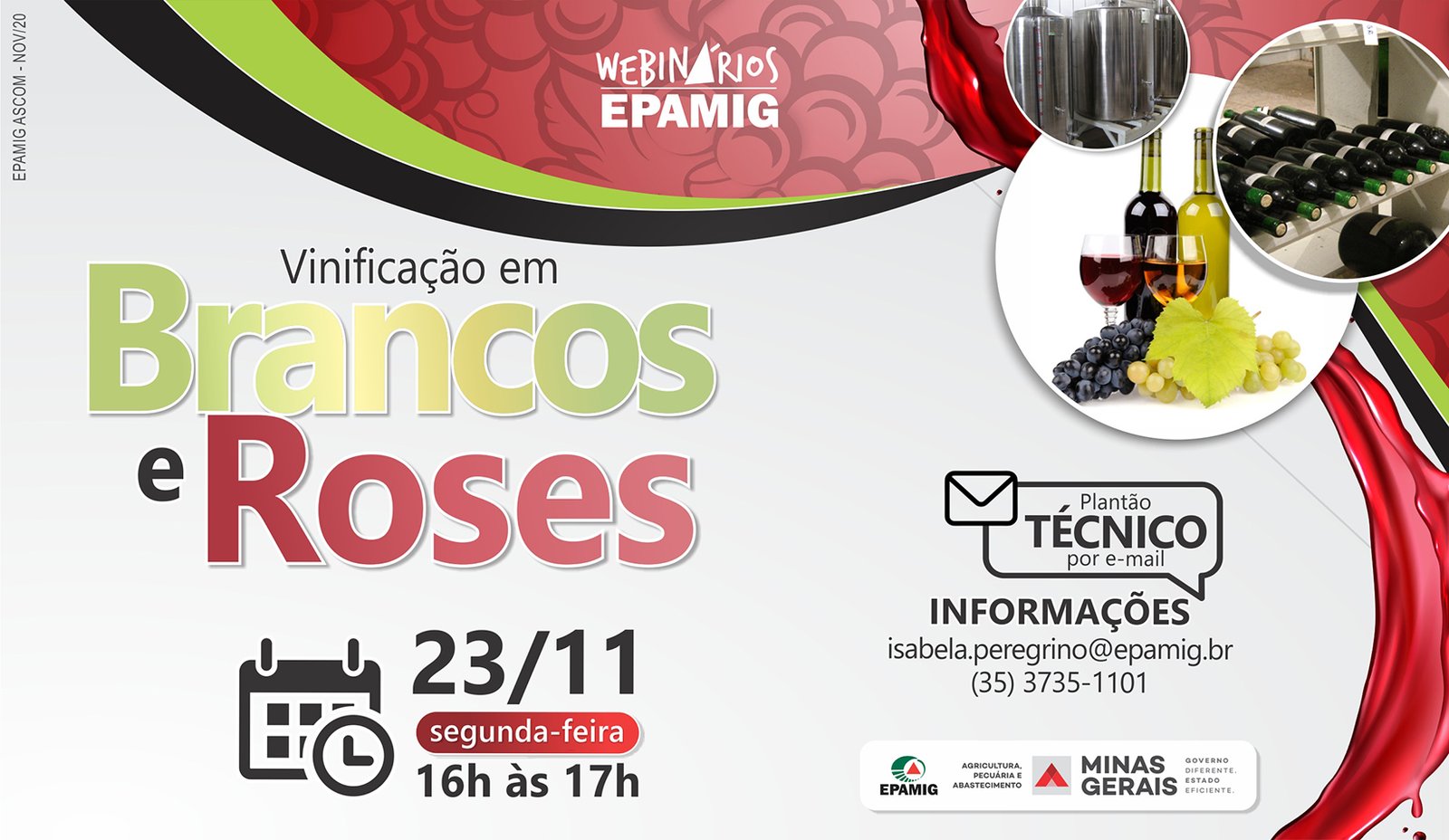 (Belo Horizonte, 20/11/2020) Vinificação em brancos e rosés é o tema do webinário sobre vitivinicultura, que a Empresa de Pesquisa Agropecuária de Minas Gerais (EPAMIG) realiza na próxima segunda-feira, 23 de novembro, às 16h. As inscrições, gratuitas, podem ser feitas pelo site.