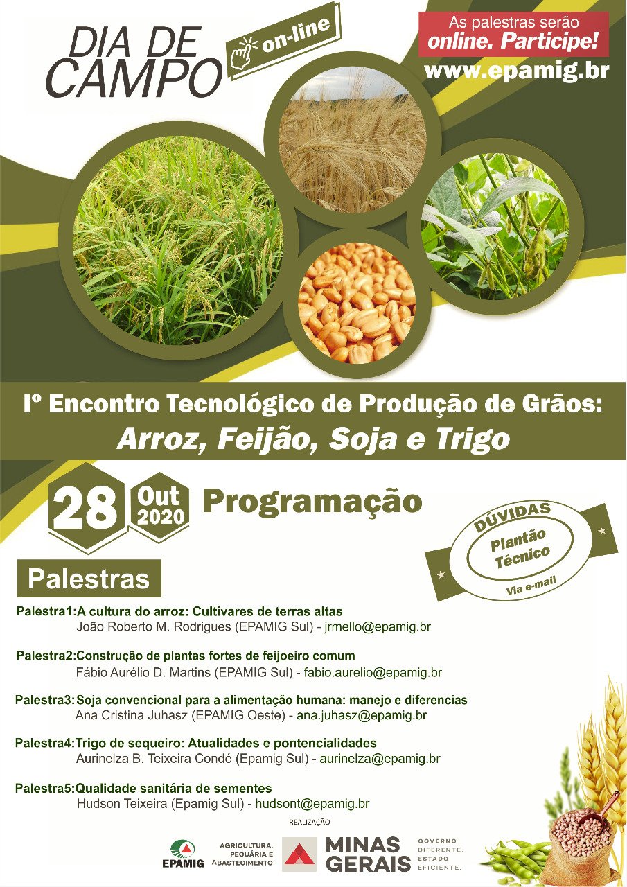 (Belo Horizonte 28/10/2020) – A Empresa de Pesquisa Agropecuária de Minas Gerais (EPAMIG) disponibiliza, por meio do Canal Oficial do YouTube, as palestras do 1º Encontro de Tecnológico de Produção de Grãos. O evento virtual traz os temas arroz, feijão, trigo, soja e qualidade de sementes.