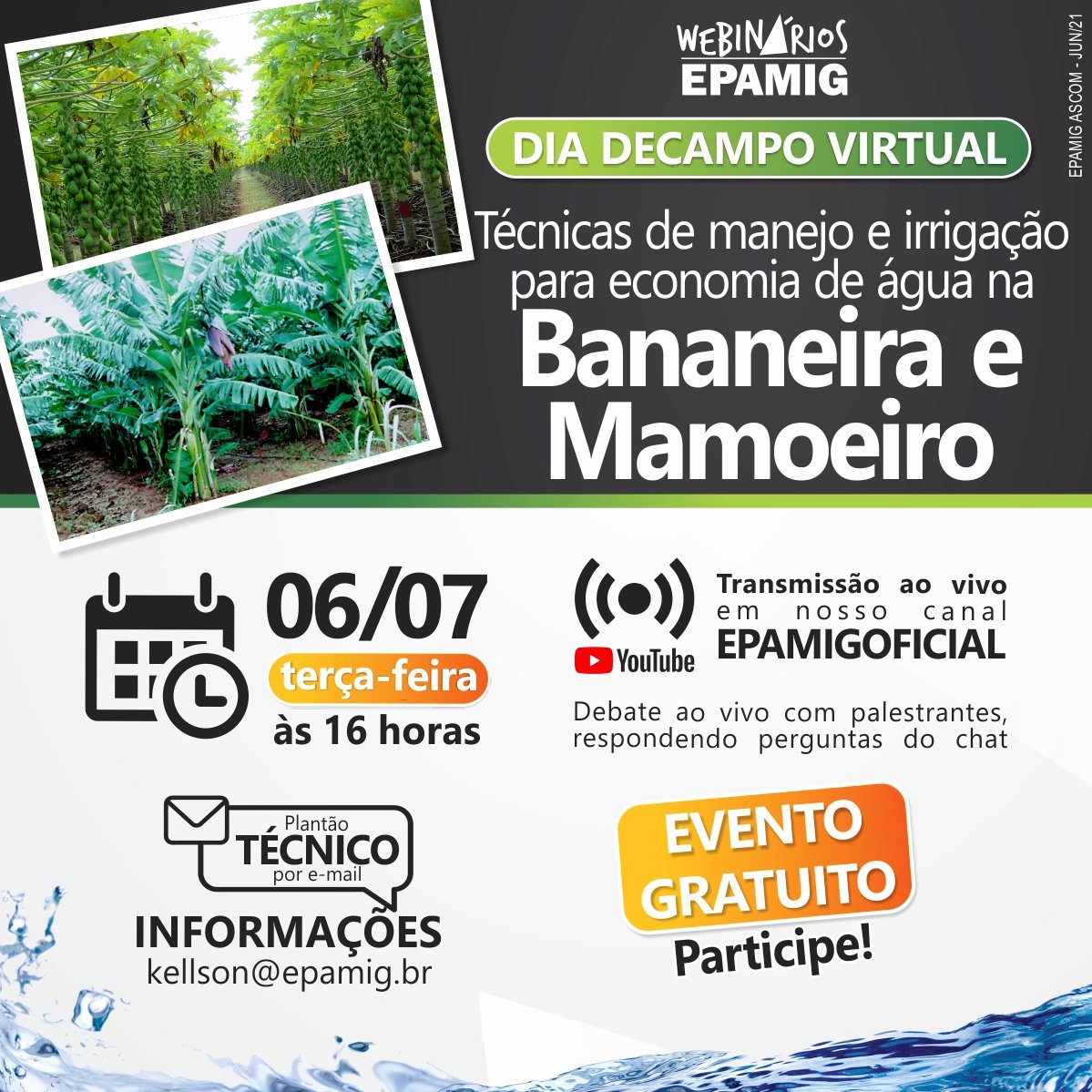 (Nova Porteirinha – 28/6/2021) – A Empresa de Pesquisa Agropecuária de Minas Gerais (EPAMIG) promove no próximo dia 6 de julho, às 16h, o Dia de Campo Virtual “Técnicas de manejo e irrigação para economia de água na bananeira e no mamoeiro”. O evento, que será transmitido ao vivo pelo Canal Oficial da Empresa no YouTube, contará com sete estações para a apresentação de técnicas de irrigação com déficit hídrico.