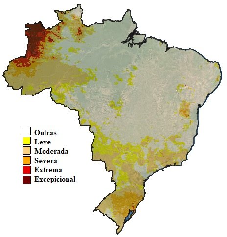 Figura 1. Condições de seca no Brasil. Adaptado a partir das análises do monitoramento da seca nos últimos dez dias, realizadas nos dados da base CHIRPS (Climate Hazards Group InfraRed Precipitation with Station data). Fonte: https://www.usda.gov/