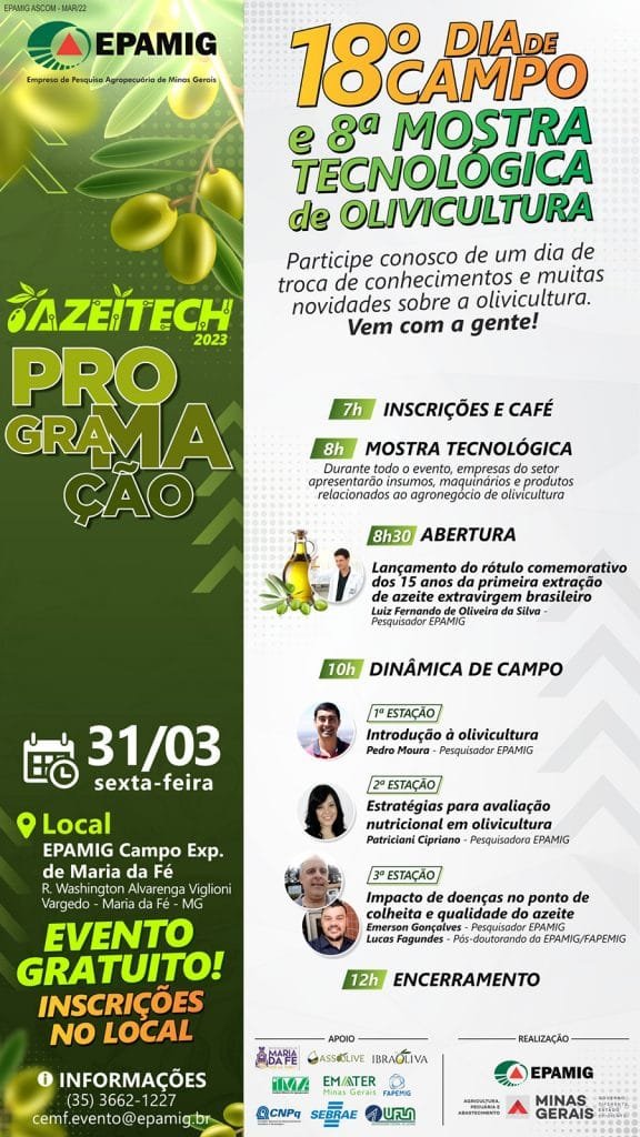 A programação será encerrada com o tema “Ibraoliva e o azeite brasileiro”. A discussão, que será mediada pela engenheira agrônoma Patriciani Cipriano que integra o Programa Estadual de Pesquisa em Olivicultura da EPAMIG, reunirá os presidentes do Instituto Brasileiro de Olivicultura (Ibraoliva), Renato Fernandes e da Associação dos Olivicultores dos Contrafortes da Mantiqueira (Assoolive), Moacir Nascimento.