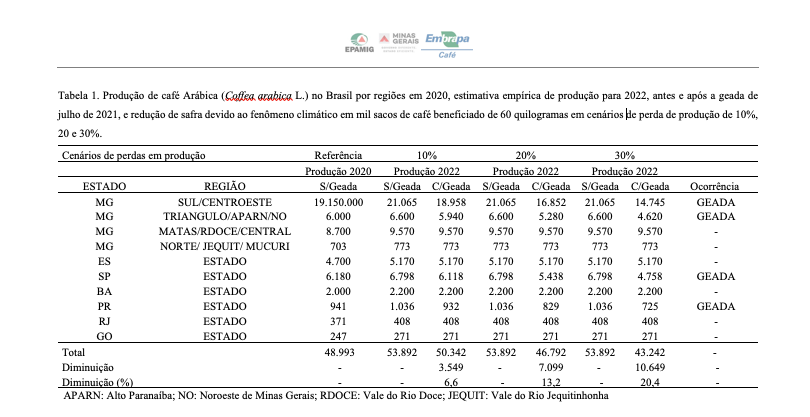Ainda é cedo para estimar-se a perda de produção para a safra de 2022 com grau de confiança aceitável. A última safra de bienalidade positiva e com clima favorável nas principais regiões produtoras de Arábica foi em 2020, com produção total de 63 milhões de sacas, sendo 48,7 milhões de Arábica. Em um cenário otimista, antes das geadas de julho de 2021, havia a expectativa de que a safra de 2022 fosse 10% superior à de 2020 (a safra 2020 foi 2,3% acima que a de 2018), teríamos uma produção de 68 milhões de sacas totais e 54 milhões de café Arábica.