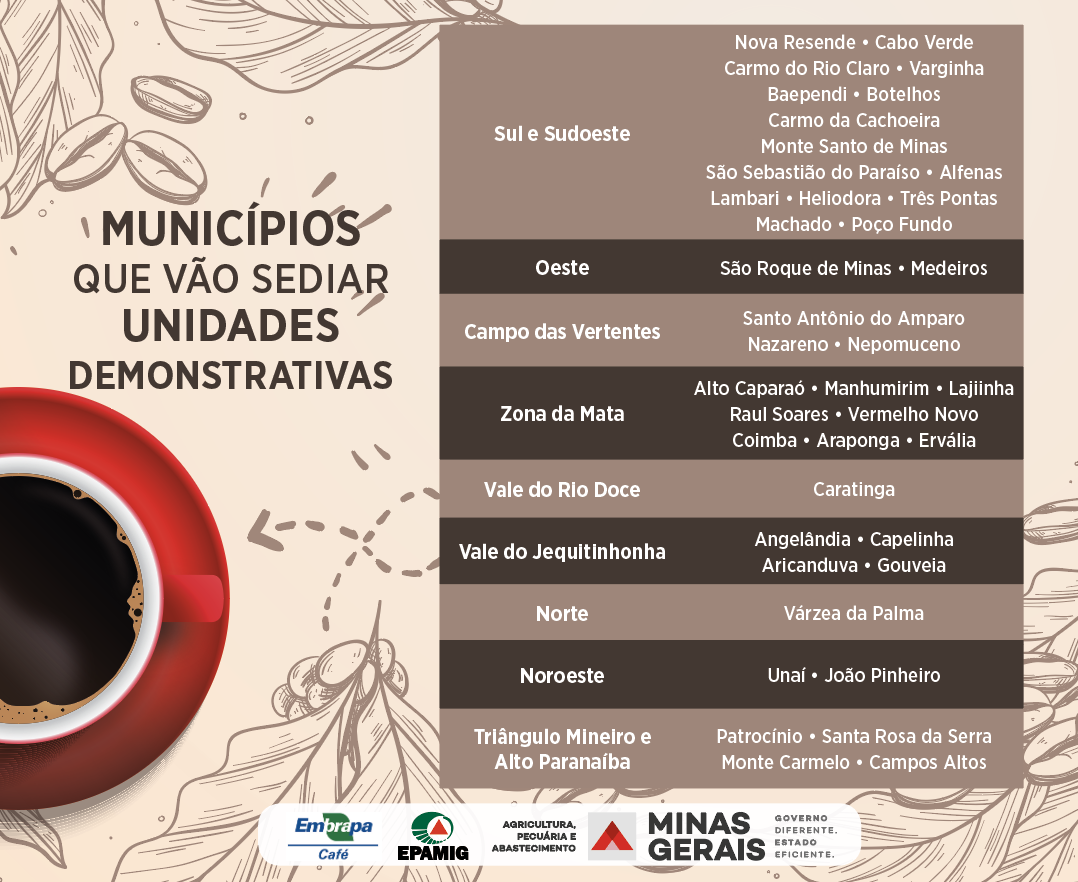 A proposta do projeto, por meio de uma parceria com 41 produtores mineiros, é apresentar a eles as novas cultivares de café mais resistentes, produtivas e com alta qualidade de bebida. Os plantios serão realizados no formato de unidades demonstrativas em 43 propriedades de municípios mineiros do Sul, Sudoeste, Oeste, Campo das Vertentes, Zona da Mata, Vale do Rio Doce, Vale do Jequitinhonha, Norte, Triângulo Mineiro e Alto Paranaíba (veja imagens a seguir).