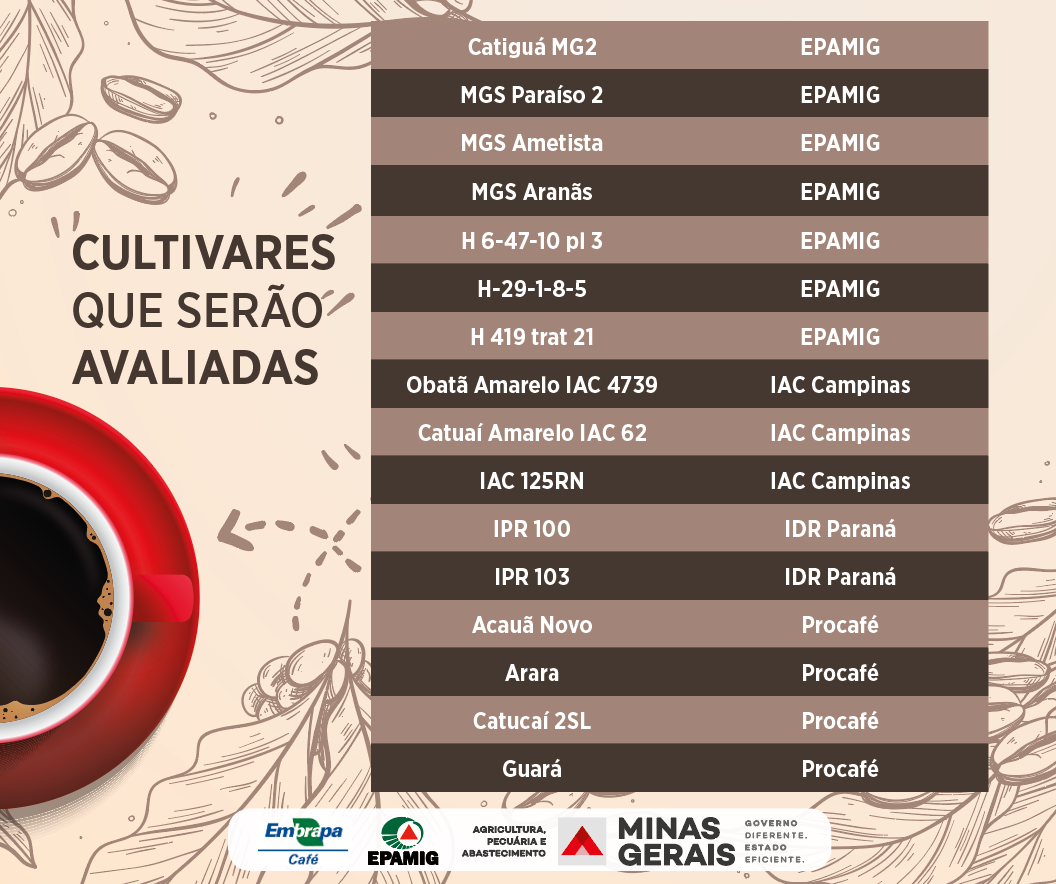 Das 16 cultivares do projeto, seis têm em sua constituição genética acessos do banco de germoplasma de café da EPAMIG. A estrutura, localizada no Campo Experimental de Patrocínio, conta com mais de 1500 acessos (registros) de espécies, variedades e cultivares de genética elevada, resistentes à ferrugem, nematoides, bicho mineiro, antracnose e outras pragas e doenças do cafeeiro.