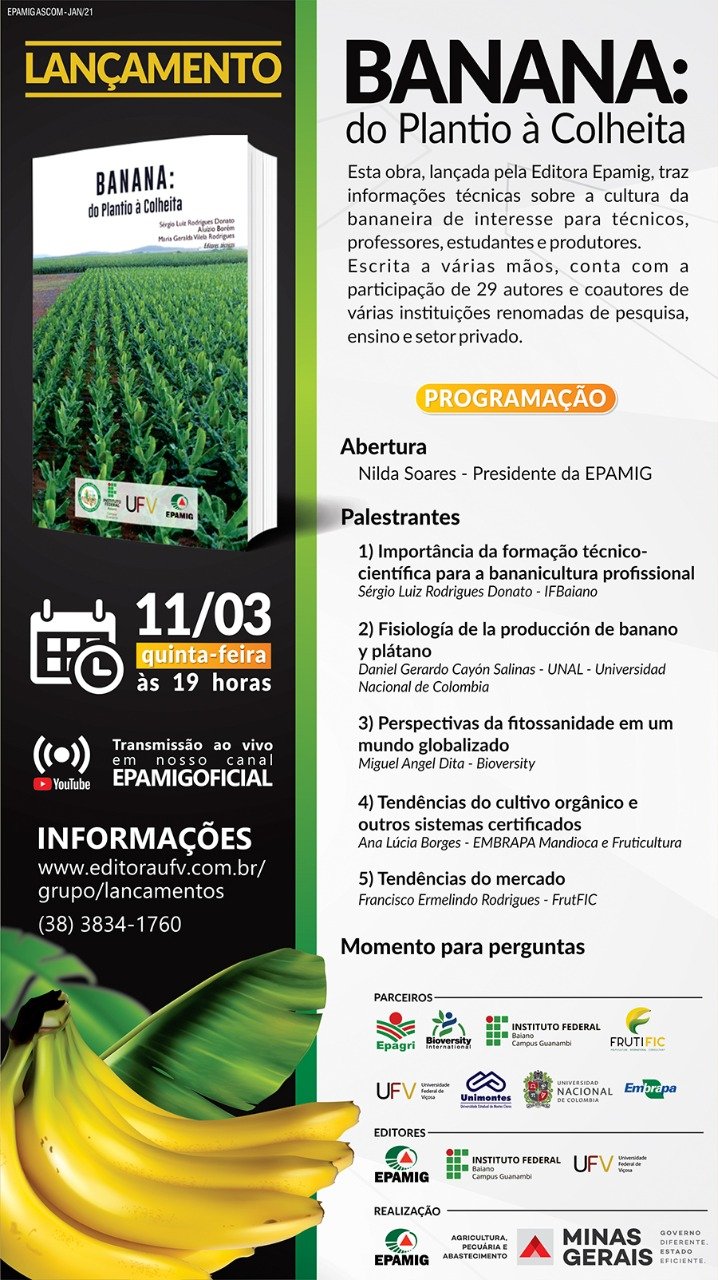(Belo Horizonte – 10/3/2021) – A Empresa de Pesquisa Agropecuária de Minas Gerais (EPAMIG) promove nesta quinta-feira, 11 de março, às 19h, o lançamento do livro “Banana do Plantio à Colheita”. A obra, elaborada em parceria com a Universidade Federal de Viçosa (UFV) e com o Instituto Federal Baiano (IF), reúne técnicas e tecnologias aplicadas à produção da fruta. A transmissão será pelo Canal Oficial da EPAMIG no Youtube e não é necessária inscrição prévia.