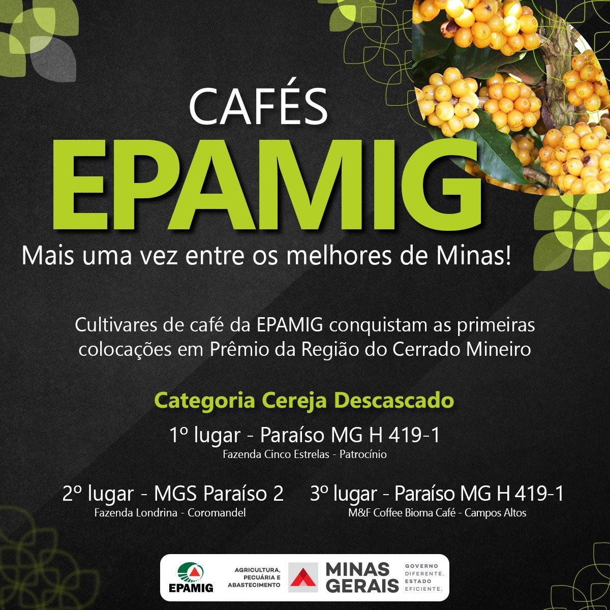 (Belo Horizonte – 22/11/2021) – As cultivares de café Paraíso MG H 419-1 e MGS Paraíso 2 desenvolvidas pela Empresa de Pesquisa Agropecuária de Minas Gerais (EPAMIG) conquistaram as três primeiras posições na categoria Cereja Descascado do 9º Prêmio de Cafés do Cerrado. Os resultados do concurso, promovido pela Federação dos Cafeicultores do Cerrado, foram divulgados na última quinta-feira, 18 de novembro.